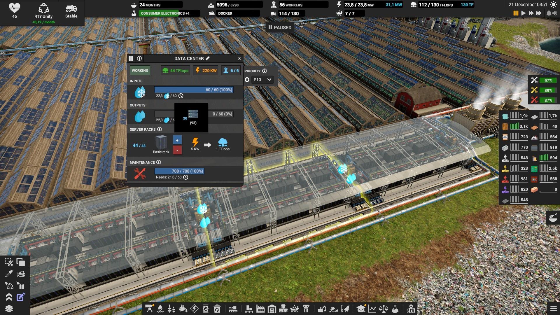 Вам понадобится ОЧЕНЬ много серверов на поздних стадиях игры, а производят их очень медленно. В дата центре 20 серверов равняются 1 Тфлопсу. На роботофабрику требуется 4 флопса, а вот на научный центр высшего уровня уже 12. Даже для простого производства микрочипов потребуется минимум 3х4 Тфлопса.