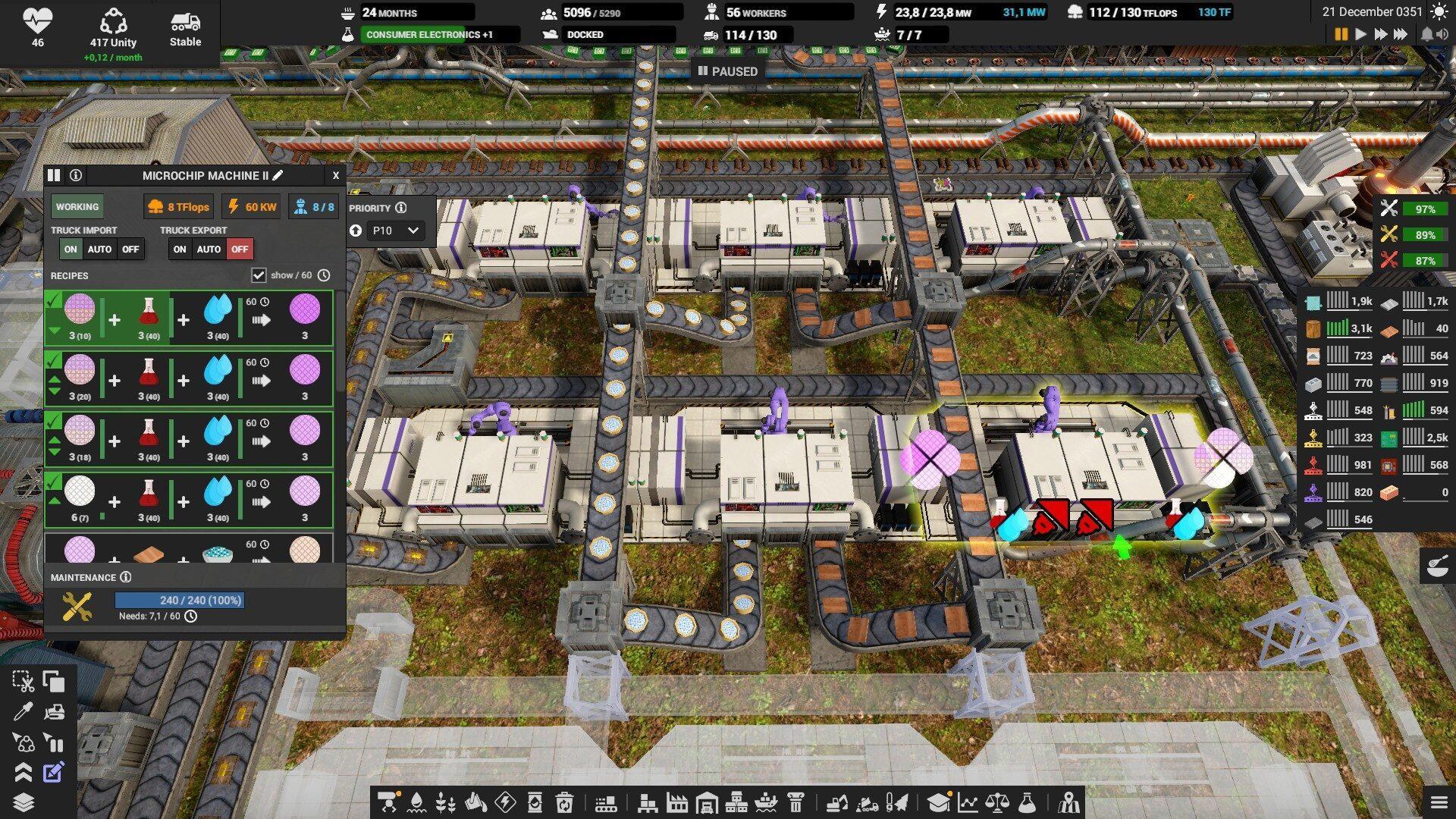 Самая оптимальная фабрика производства микрочипов состоит из 3 заводских единиц с циркулирующим производством, так как имеется всего 12 стадий производства микрочипов. Чем выше рецепт в списке, тем больший у него приоритет.