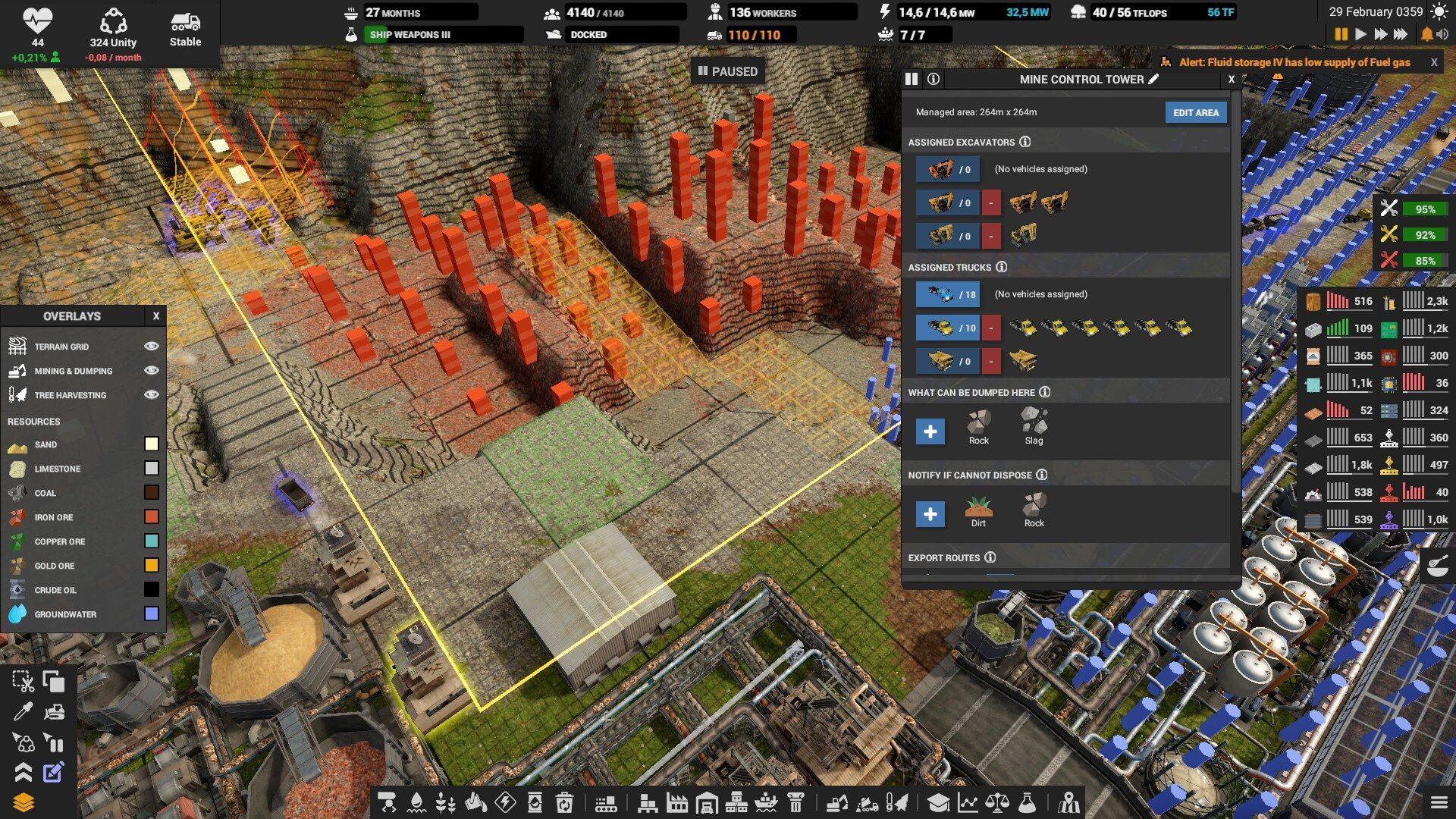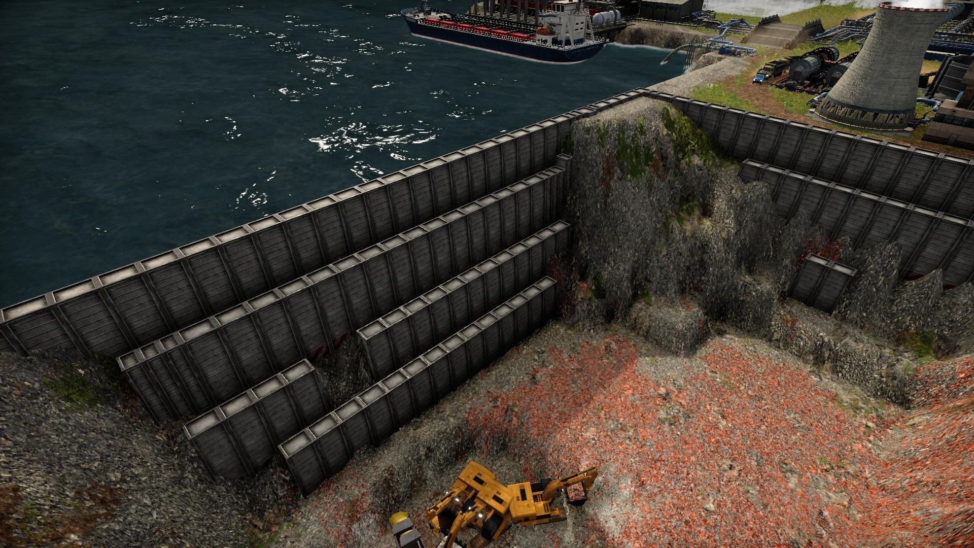 Для работы экономики требуется сырьё, которое вы будете добывать вручную. Я не шучу, планирование карьеров будет полностью зависеть от вас, что естественно повлияет на эффективность извлечения. В первую очередь надо понимать, что самосвалам и грузовикам понадобится спуск в карьер причём такой, который не обвалился при добыче. Порода сползает и её нужно укреплять стенами. Лишнюю породу можно использовать для засыпания моря или же для постройки пандусов на новые уровни карты. Спойлер: с самого начала посмотрите, где располагаются залежи, ведь на многих картах к ним надо очень упорно пробиваться и насыпать пути.