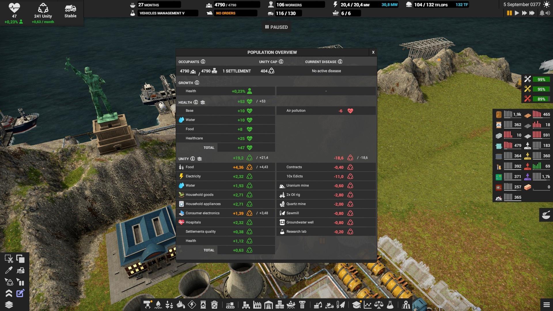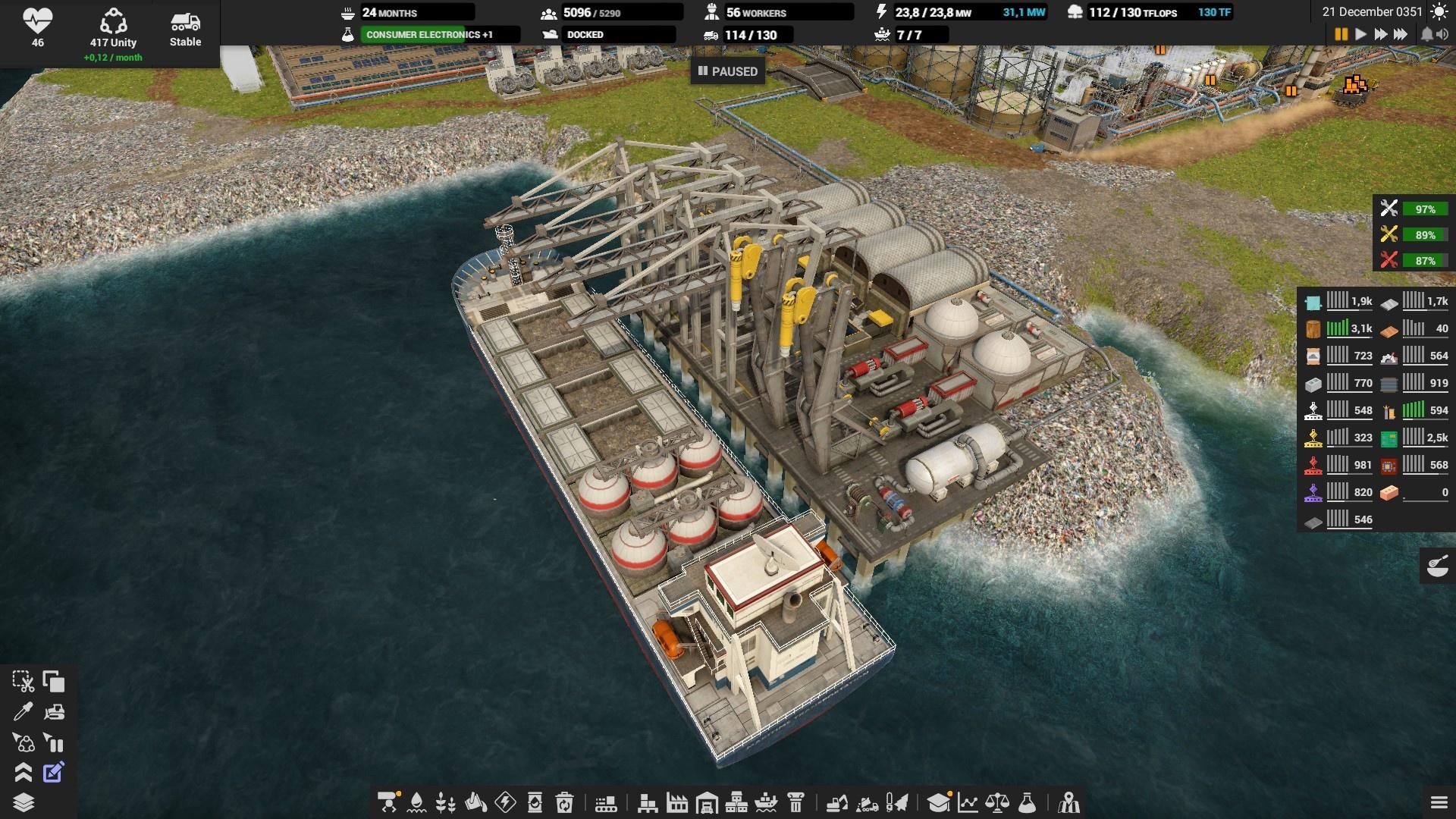 Ресурсы конечны, поэтому стоит как можно раньше озаботиться переработкой лома и открытием месторождений на глобальной карте. В первую очередь закончится нефть — лучше выбрать в качестве приоритета вышку в океане .