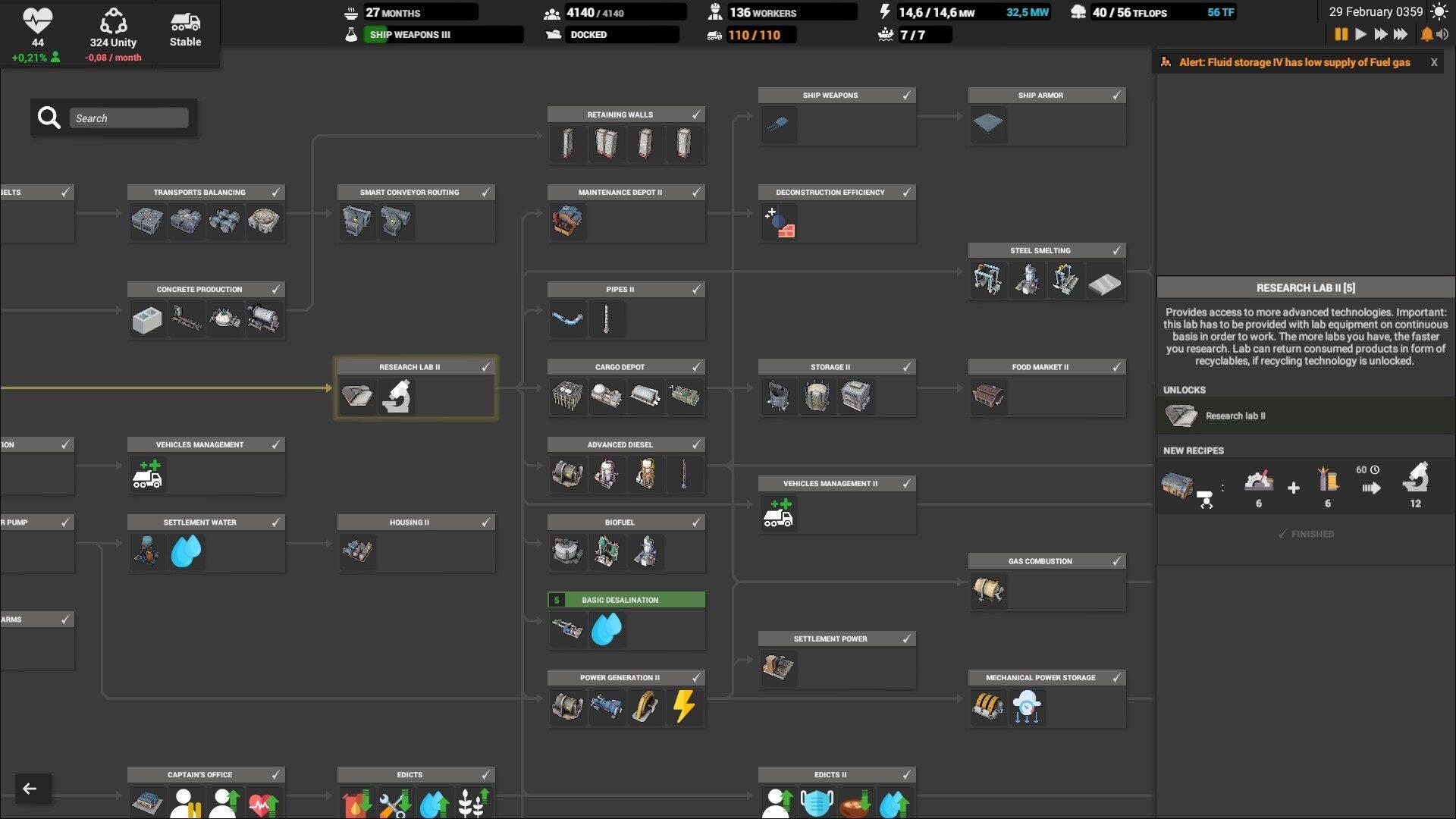 Исследовать стоит в первую очередь то, что позволяет уменьшить потребление ресурсов, ведь они (в основном) не бесконечны и чем меньше вы пустите поначалу в трубу, тем меньше вам придётся напрягаться для их получения. На ранней стадии одна из самых полезных технологий — это заправки, благодаря которым вашим экскаваторам не придётся самим постоянно мотаться за топливом к ближайшей цистерне с дизелем. Также стоит открыть как можно раньше усиленный бетон, который резко повысит производство бетонных блоков (скорее всего именно они у вас раньше всего закончатся), а ведь строительство — это то, чем вы будете заниматься в первую очередь.