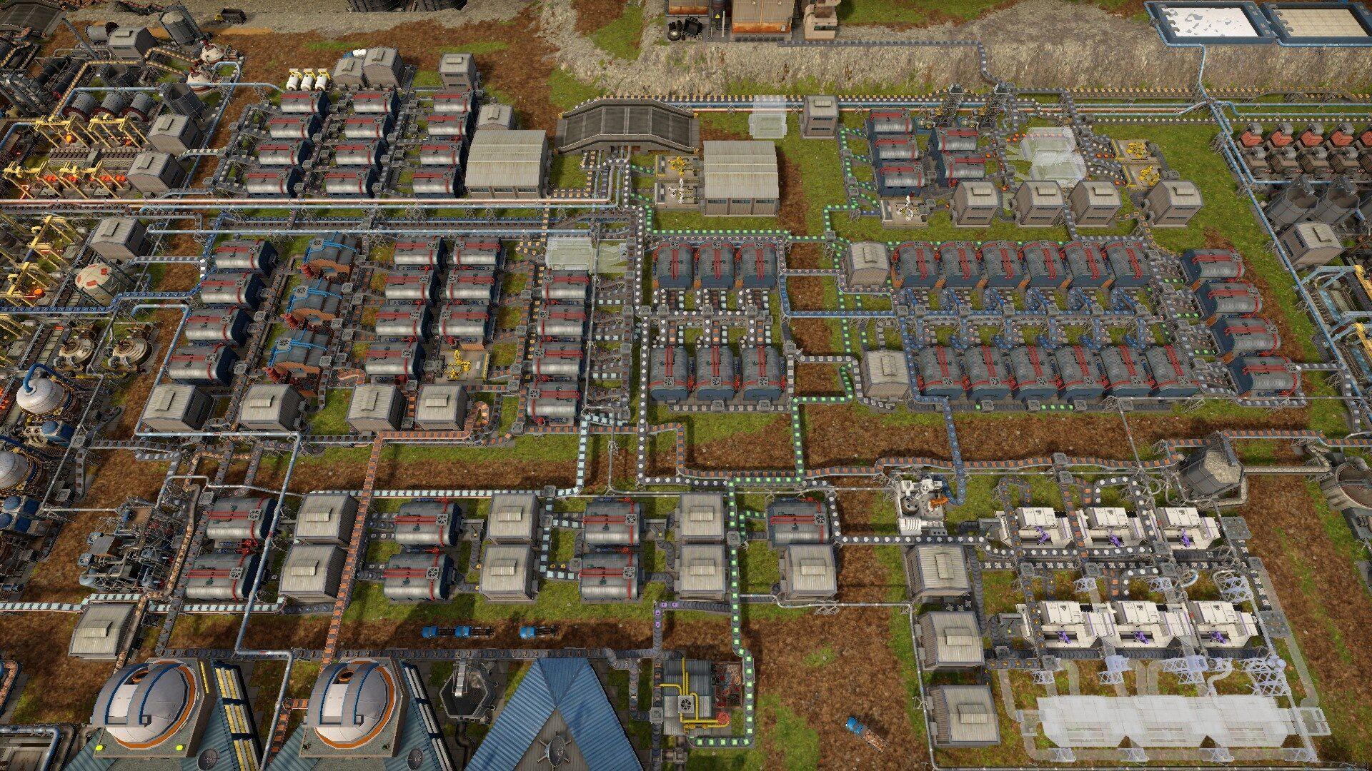 При планировании строительства надо обязательно учитывать, что цепочки производства очень длинные и желательно позже иметь возможность легко соединить конвейерами стадии производства. НО, обязательно оставляйте хотя бы одну клетку между зданиями. При прокладке очередной трубы скажете себе спасибо.