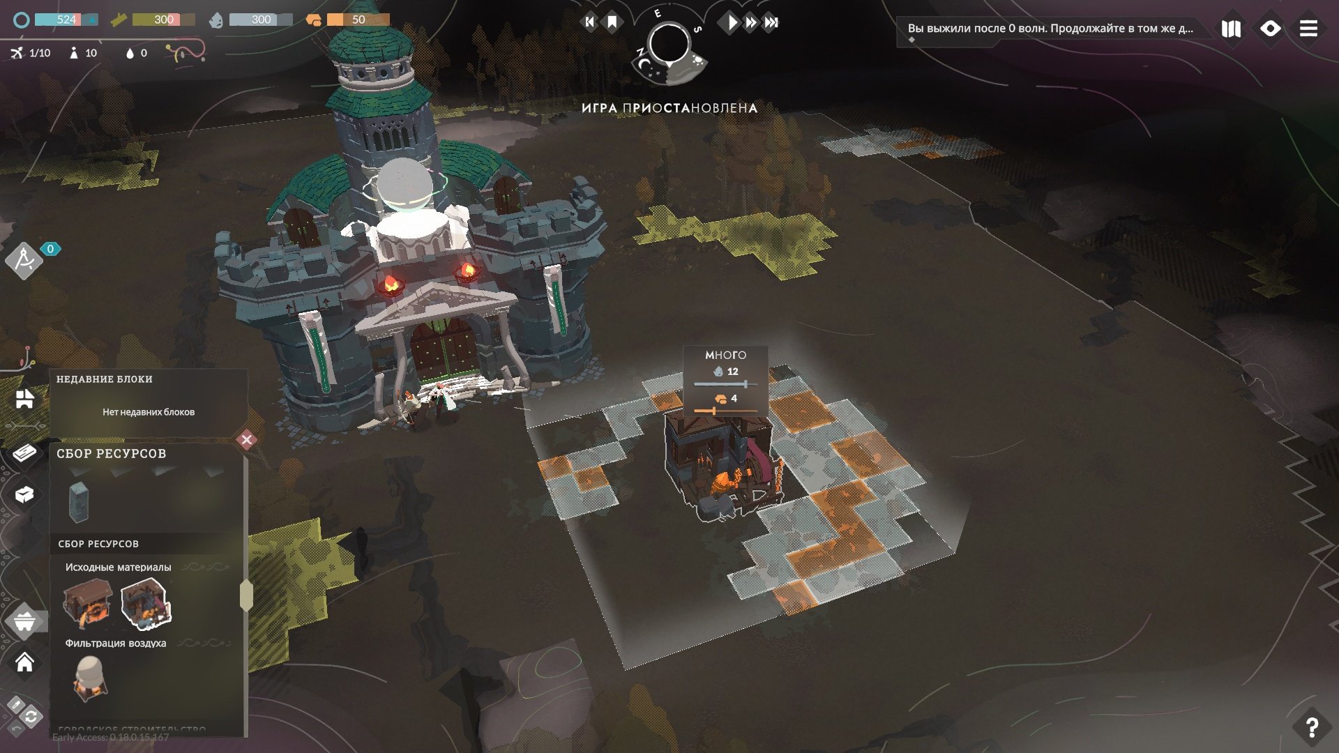 В игре немного различных ресурсов – кислород, камень, древесина, минералы, люди и туман. Кислород, камень, древесина и минералы нужны для постройки, улучшений, найма и всего подряд, это 4 практически равноценных ресурса, с разными коэффициентами добычи. Без кислорода будет плохо, ведь вокруг туман, который не щадит никого. Древесина и камень в большинстве своём будут уходить на постройки и стены. Минералы нужны для вспомогательных штук и лучших войск.