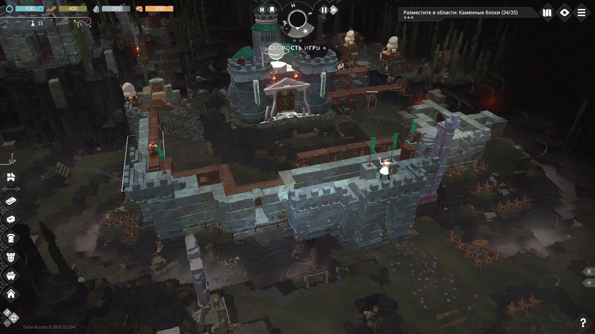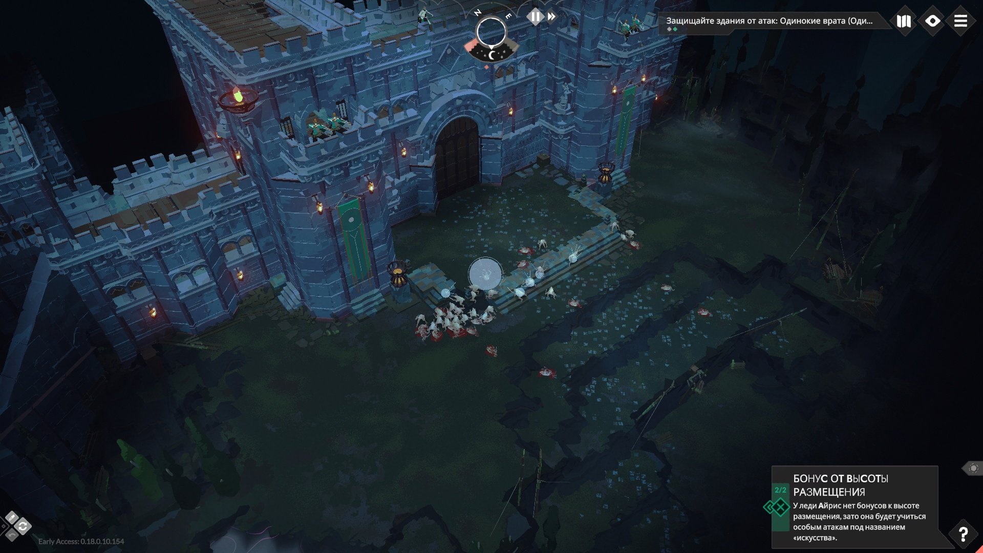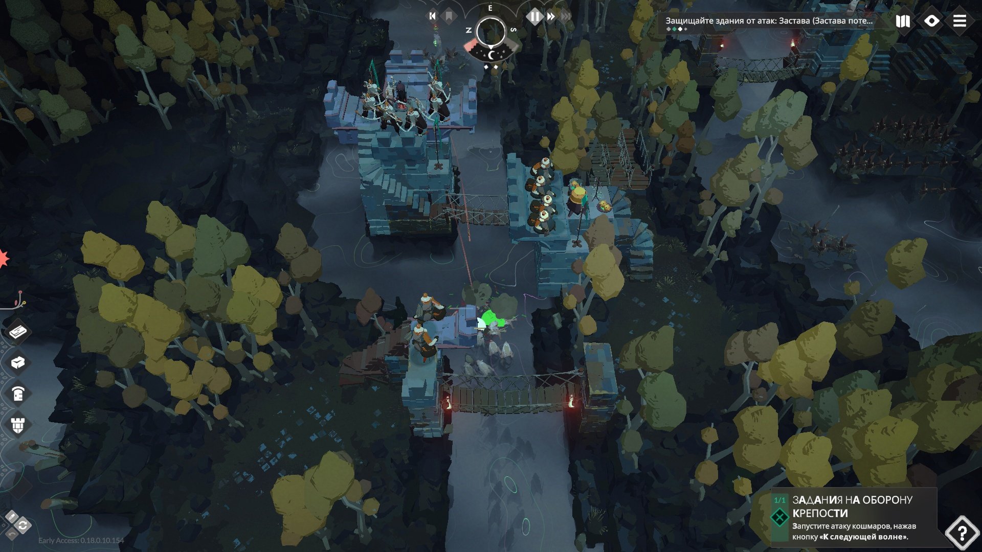 Пауза – для полного комфорта доступна тактическая пауза. Время останавливается и игрок моментально может возвести целый бастион стен. Доступно и ускорение времени, что очень приятно. Понятно, что это позволяет не выжидать добычи ресурсов или скоротечно истребить остатки врагов.