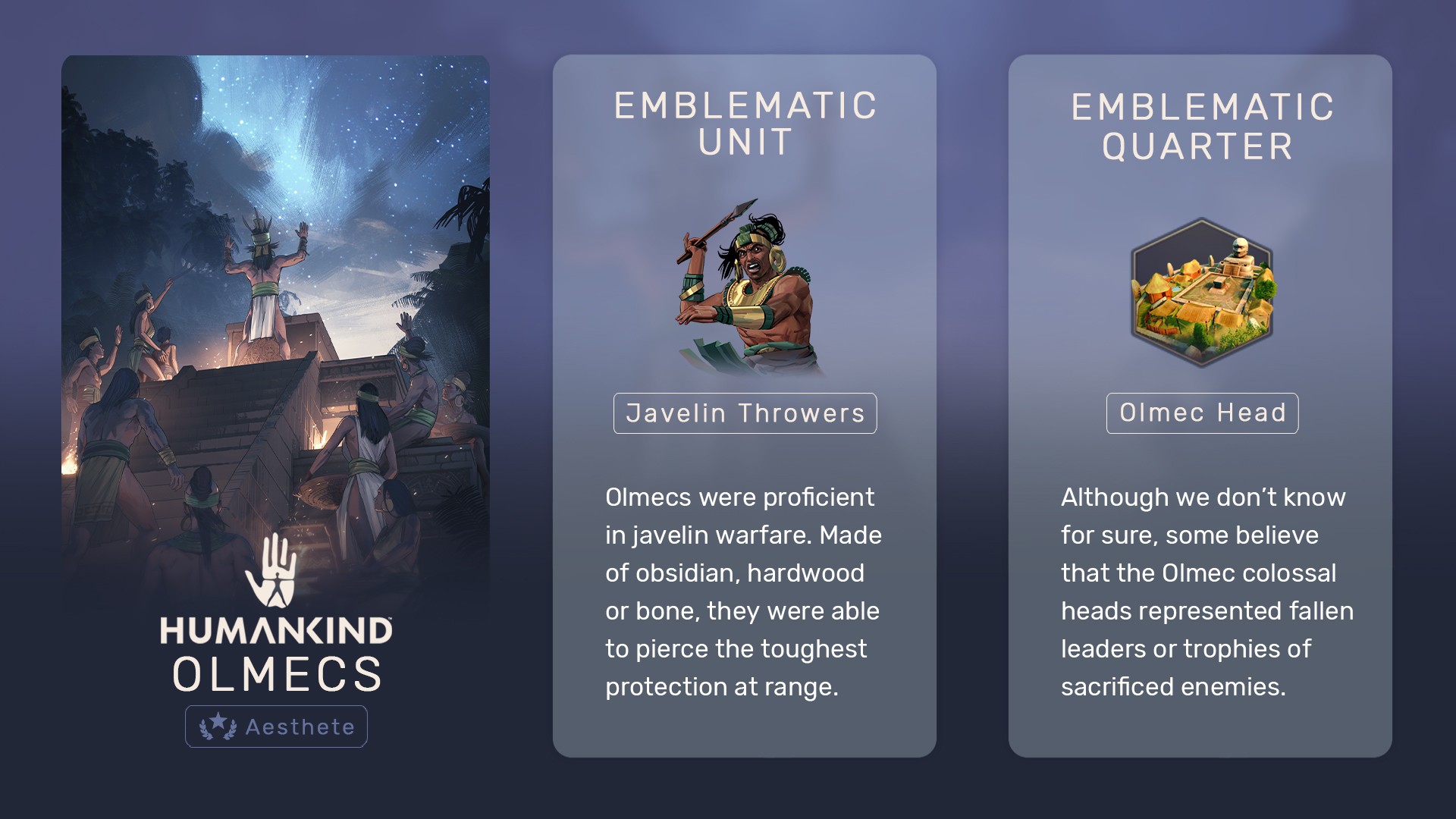 Разработчики исторической 4X стратегии Humankind представили очередную культуру, которая будет присутствовать в игре – Ольмеки. Ольмеки на протяжении веков обитали в Центральной Америке, оставив богатое наследство последующим мезоамериканским культурам, таким как Майая, Сапотеки и Ацтеки.