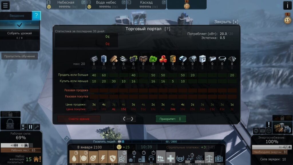 Первым строением, открывающим экономические отношения с миром извне, является «торговый портал». Из него в начале дня выплывает баржа, на которой уже погружены заказанные вами товары. Остаётся только перенести их на склад дронами, иначе они так и улетят обратно. Впрочем, не беспокойтесь; заказать можно сколько угодно много, а вот деньги уйдут только на перенесённый продукт.