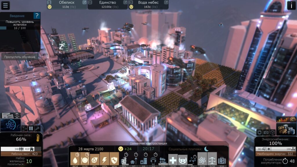 Даже связать города между собой можно различными способами, начиная от обыкновенного моста, заканчивая метро и различными шаттлами. К слову, о воздушной технике: тут она выполняет основную роль. Автоматизированные дроны грузят и перемещают все ресурсы, из-за чего их всегда будет не хватать. Поначалу вы даже будете не успевать разгрузить и загрузить товары, присланные вам на обмен в течение дня. Благо, у зданий есть «приоритет», через который и можно управлять дронами.