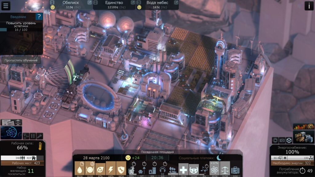 Но вот если вы хотели увидеть «хардкор», то проходите мимо; FrostPunk’ом тут и не пахнет. За десяток наигранных часов катаклизмы практически не встречались. Конечно, заводы ухудшают экологию, но и это можно исправить и обойти несколькими путями, например торговлей или очистителями воздуха.