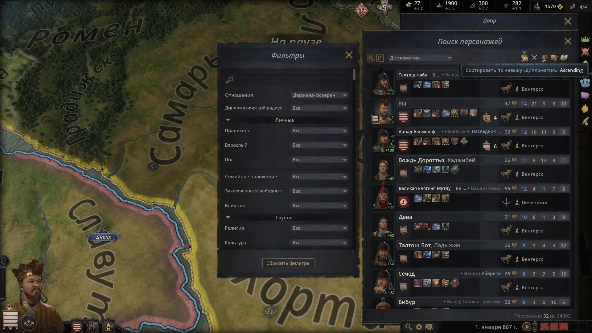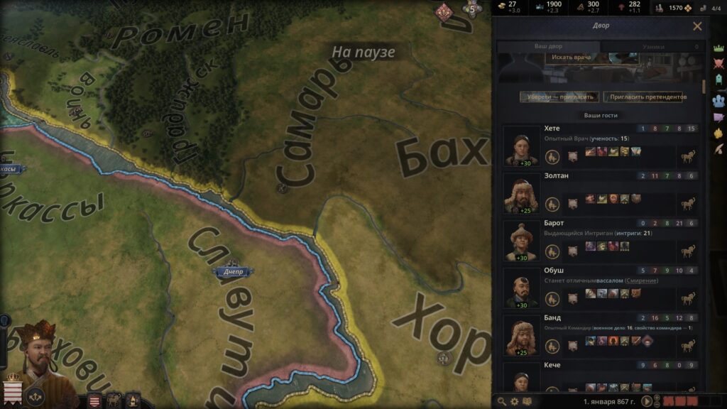 Прежде всего, оцените существующих претендентов – в совет могут попасть лишь ваши придворные. Посмотрите среди них на персонажей с искомым высоким навыком (для Управляющего – управление, для Маршала – военное дело и так далее), благо в игре реализованы очень удобные фильтры, которые помогают облегчить поиск. На первых порах значение в районе 15-18 будет достаточным. Однако, в большинстве случаев у вас при дворе не окажется скилловых советников для каждой должности. В этом случае стоит осмотреться в поисках хороших кандидатов в соседних землях. Обратите внимание на персонажей, которые хорошо относятся к вам – призвать их к своему двору больше шансов. Но и даже тогда, может не найтись подходящих людей. Что же делать?