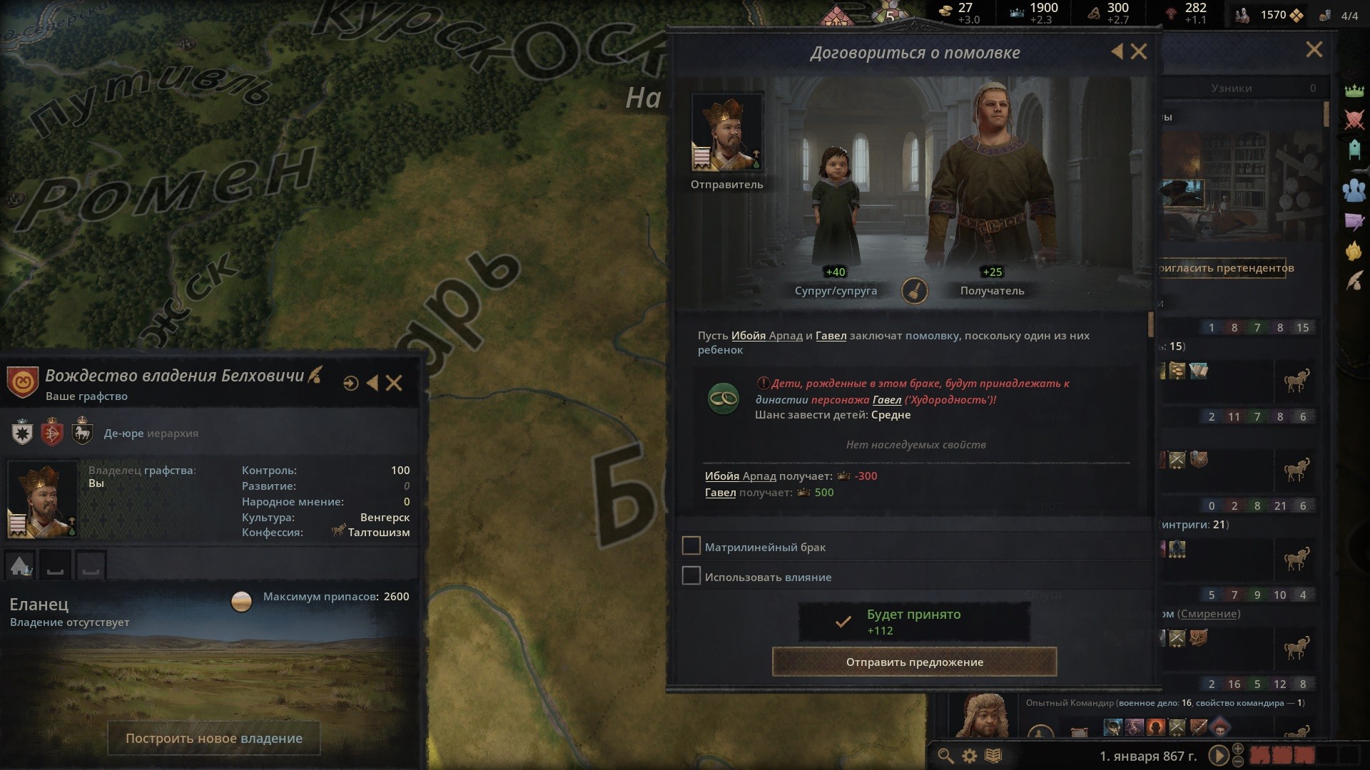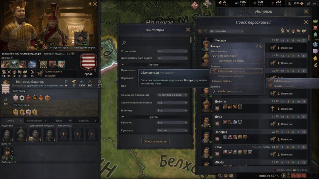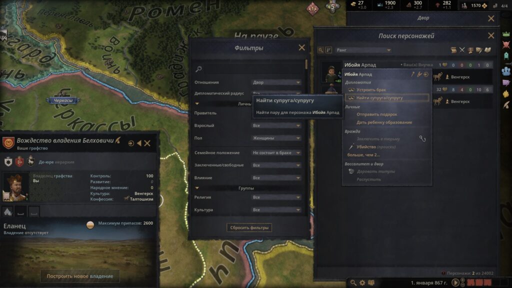 Верный способ привлечь к себе нужных персонажей – сыграть свадьбу. Посмотрите, кто из ваших придворных еще не обременён узами Гименея и начинайте подбор. Так как в совете важен пол, обратите больше внимания на своих незамужних дам, чтобы привлечь потенциальных кавалеров, ведь на первых порах женщины при дворе могут занять место лишь тайного советника. После того, как нашли подходящего жениха, не забудьте указать, что брак будет матрилинейным, ведь без этого милая дама сама покинет ваш двор и будет служить сюзерену своего мужа. Это тоже относительно быстрый способ заполучить ценные кадры в свою копилку.