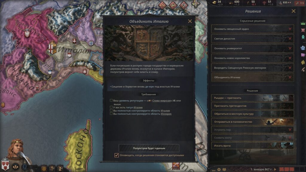 После принятия итальянской культуры, в вашем меню решений появится «Объединение Италии». Для объединения Италии вам понадобится: