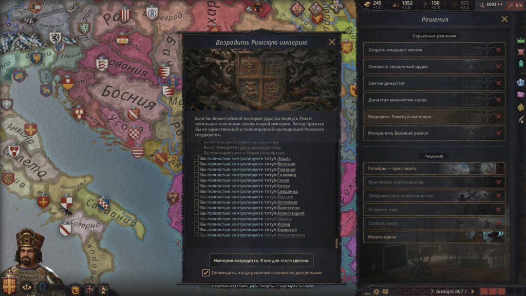 Когда вы носите титул императора Византии, решение о восстановлении Римской империи сразу будет вам доступно. Оно отображается в меню решений и имеет следующие требования: