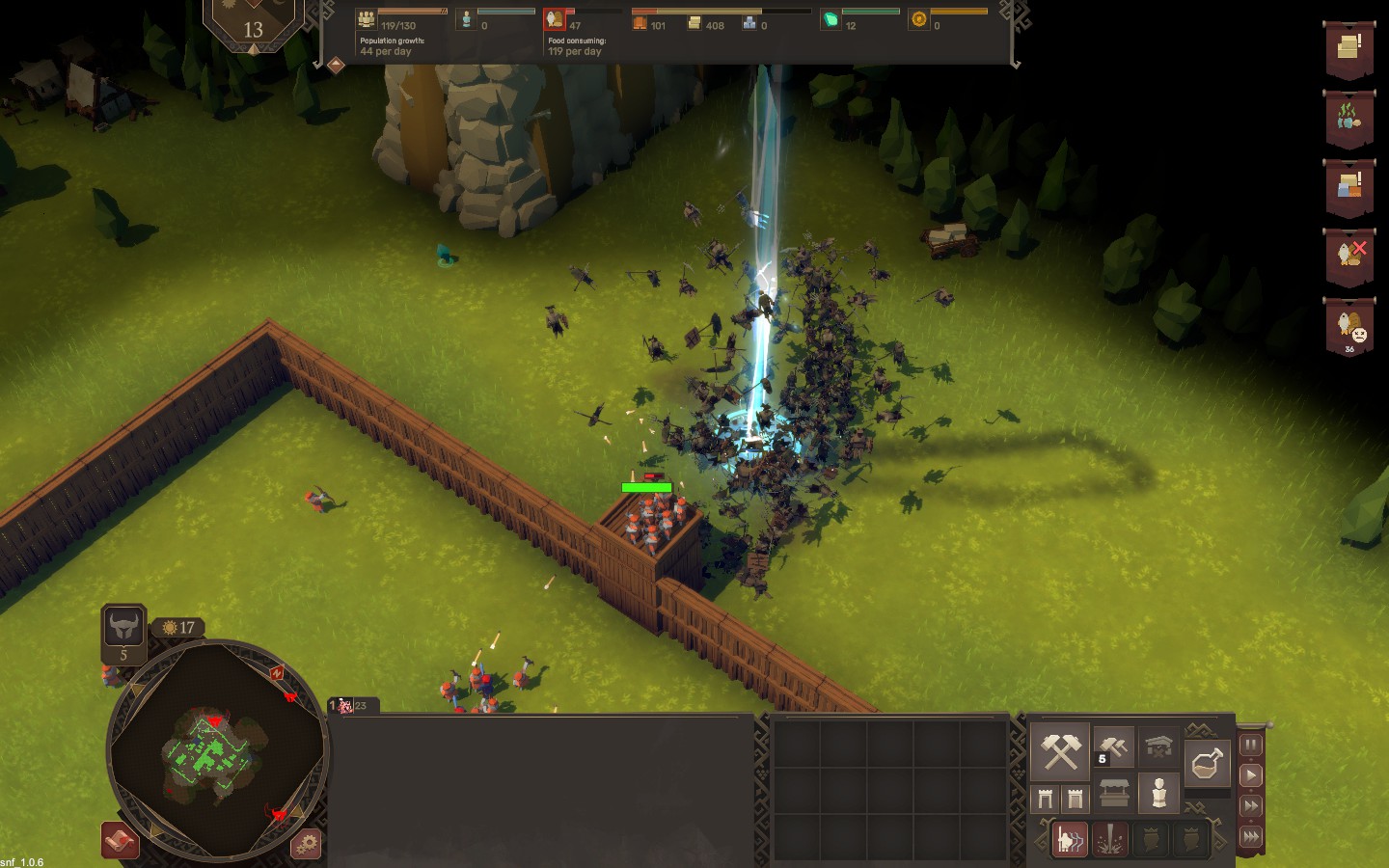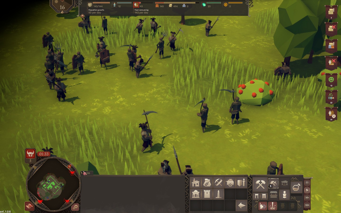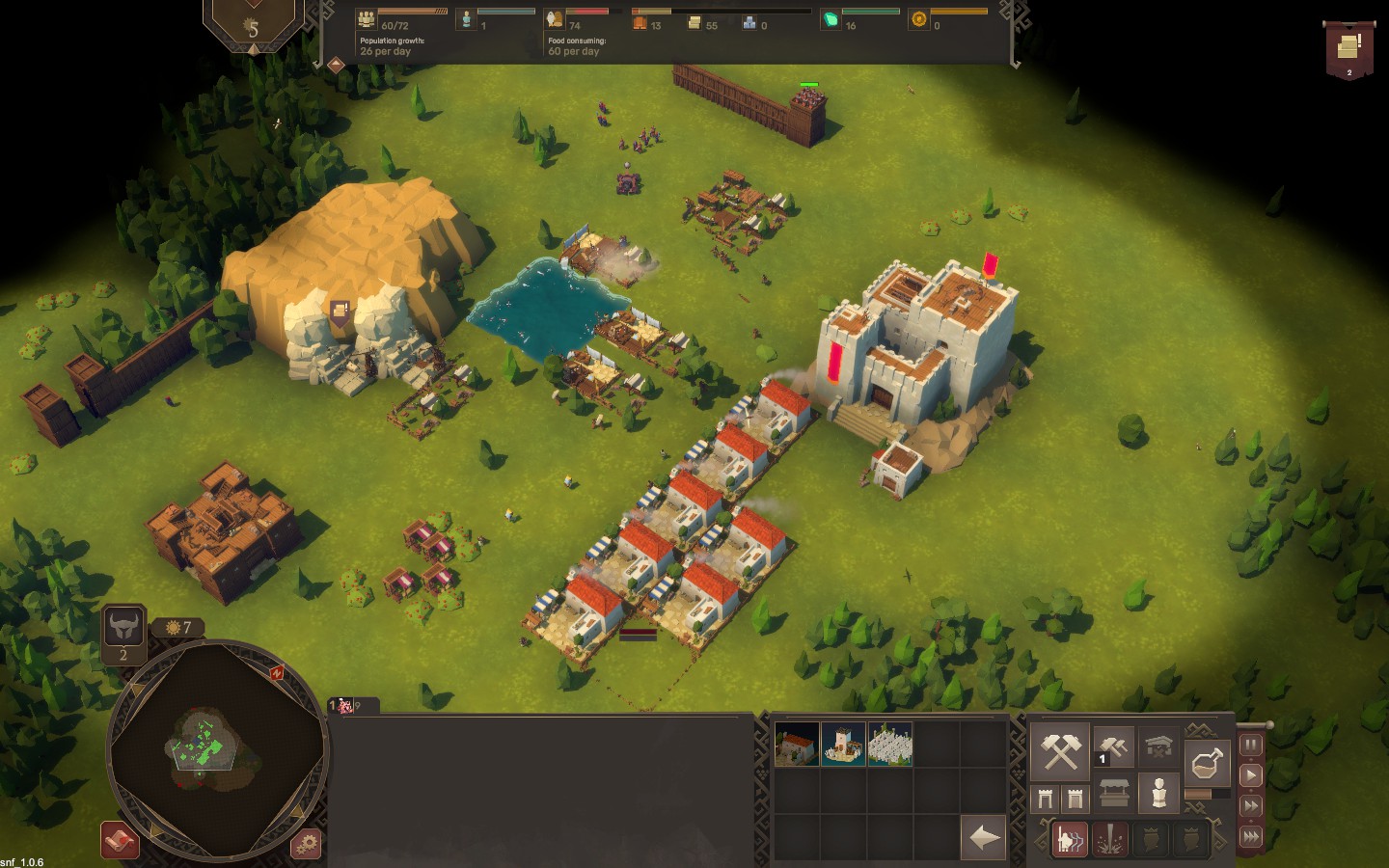 В демо присутствует ограниченный набор зданий и юнитов, но уже всё это даёт возможность ощутить динамику игры. Каждая новая партия начинается на случайной карте, и суть довольно проста: построить здания, добывающие лес и камень, чтобы строить… ещё больше зданий и выживать. Жилые дома позволяют каждый день приходить в поселение новым жителям, из которых можно сделать новых работников и нанять войска. И снова что-то напоминает… ах да, серию Stronghold. Однако есть и отличие: здания здесь строятся не мгновенно из воздуха, а с помощью рабочих, которым надо дойти до места стройки и здание построить. А вот в остальном система экономики и строительства выглядит почти также. Есть даже стены.