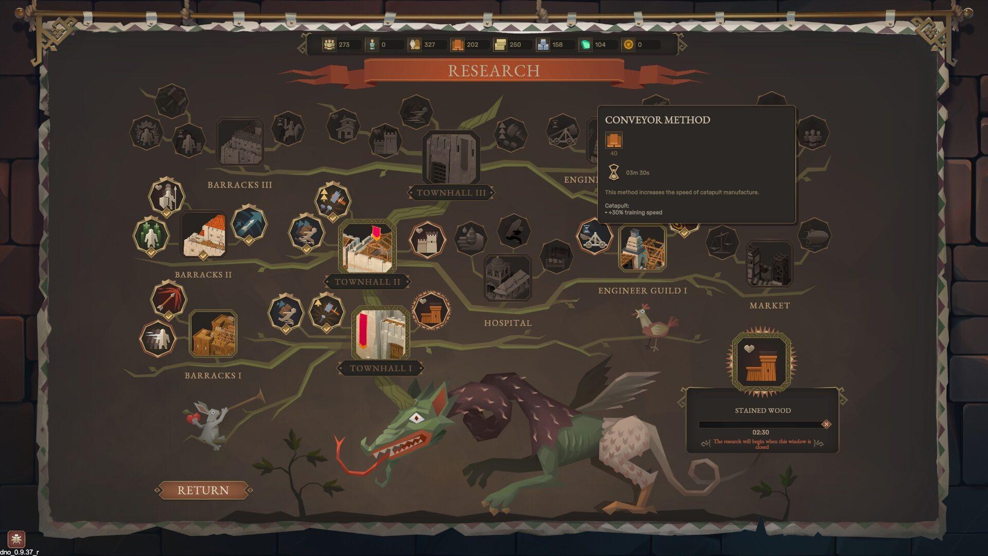 В игре есть небольшое, но довольно занятное дерево развития технологий. Возможности исследования на нём открываются по мере постройки конкретных зданий. Построил казармы? Можешь улучшить лучников. Проапгрейдил замок? Получи ботинки на железной подошве для ускорения рабочих. Как я уже говорил, на то, чтоб начать исследования, требуется выделить определённые ресурсы, после чего включается счётчик, и через пару минут юниты (или строения) получают изученную способность. Скорость исследований можно повысить за счёт строительства университета.