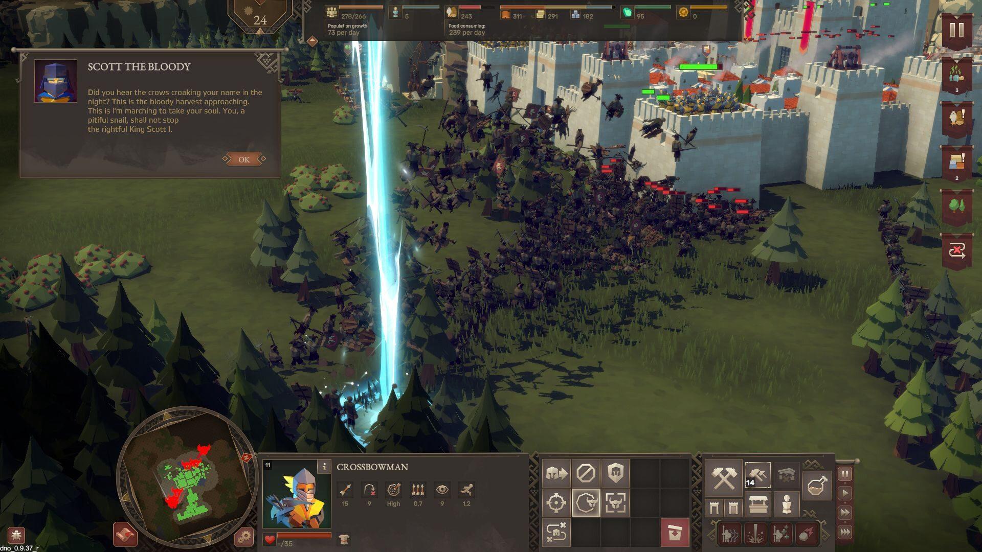 Ещё одной интересной механикой игры является магия. Доступ к заклинаниям открывается с постройкой и улучшением стелы. Но для того, чтоб произнести заклятие, надо добыть нужное количество магических кристаллов, а они появляются только на месте разрушенных домиков восставших (человеческие жертвоприношения, не иначе), что делает проведения рейдов по карте вдвойне привлекательным. Луч смерти, например, при скромной цене в 5 кристалликов способен изничтожить целую волну наступающих, что абсолютно бесценно в тот момент, когда часть стен рухнула, а подкрепление ещё в пути.