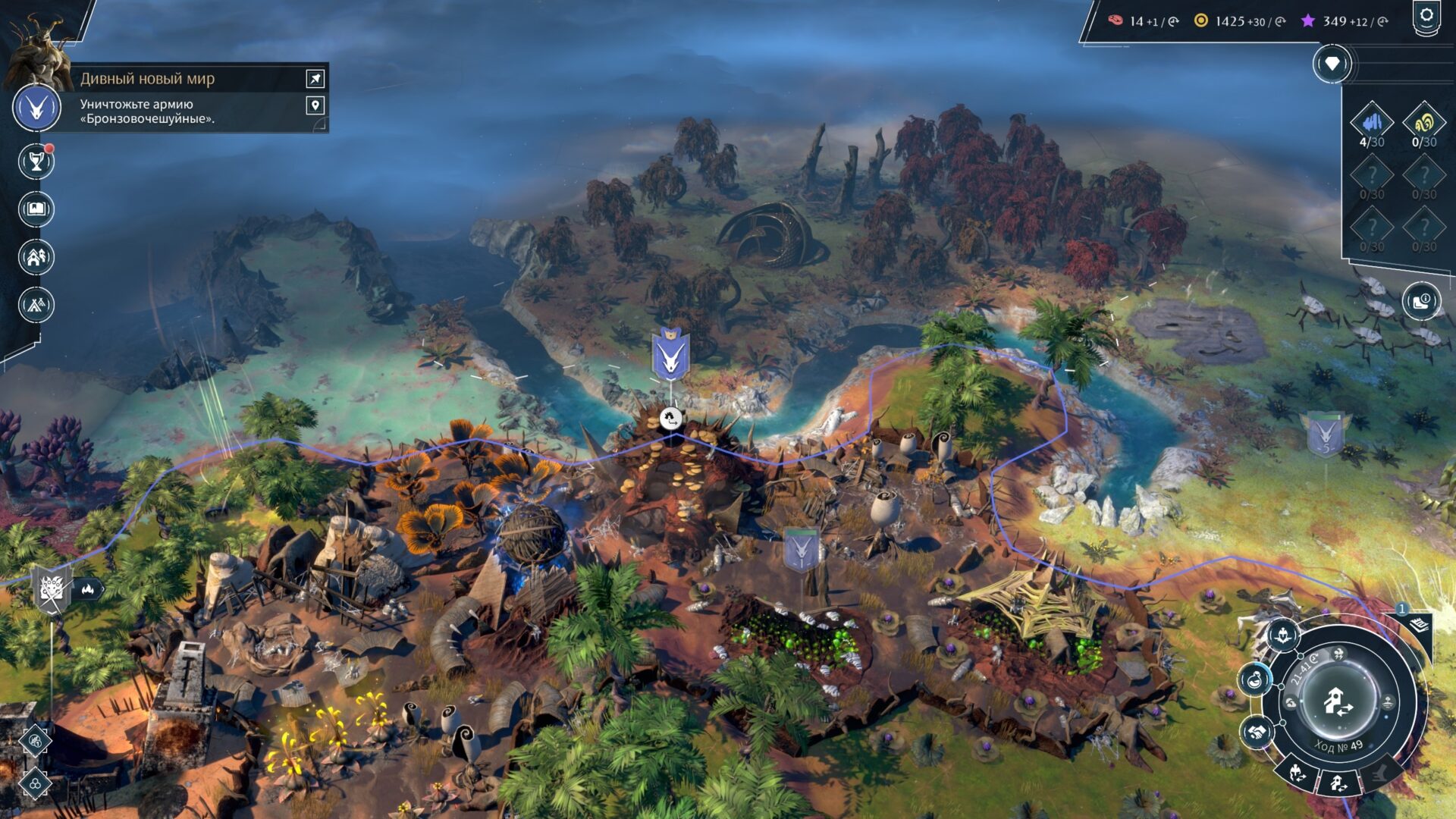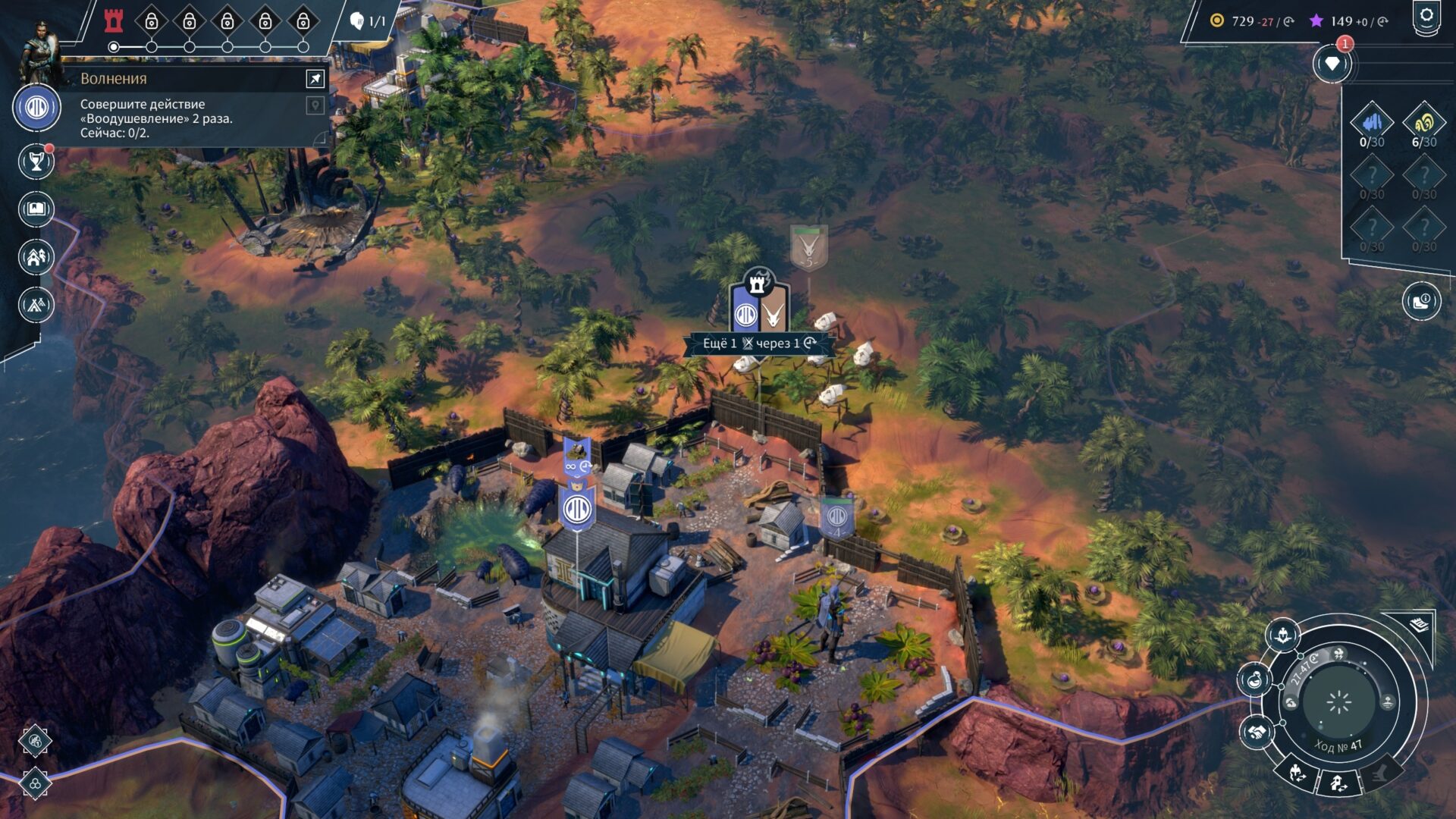 На глобальной карте, разделённой на гексы (шестиугольники), геймплей в целом классический, необходимо находить наиболее удачные места для новых городов, развивать существующие, строить юниты, проводить переговоры и выбирать исследования. Развитие городов происходит по нескольким направлениям: во-первых, можно и нужно покупать новые гексы, на которые распространится территория города и, соответственно, с них можно будет собирать ресурсы. Во-вторых, на подконтрольных городу гексах можно возводить различные строения, будь то фермы, мастерские, лаборатории и так далее. Строения впоследствии можно будет также улучшать. В-третьих, есть набор общегородских улучшений, не привязанных к территориям. Радует то, что в поздней игре с большим количеством городов и районов игра не начинает тормозить. А вот намного меньше радует интерфейс развития города, совершенно неочевидно, какие гексы застроены, а какие нет.