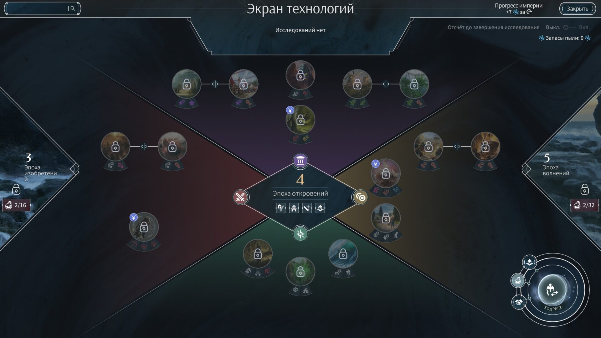 Ещё одним ярким примером стандартизированности игры является её научное дерево. Казалось бы, исследований в нём много, они интересны, открывают новые возможности… Однако у всех трёх фракций они на 95% идентичны. Возможно, есть по 1-2 уникальных технологии в каждой из 6 эпох, но не более. Пожиратели трупов, полуроботы и космические колонисты в первой эпохе с одинаковым рвением открывают заборы для возможности строительства ферм и чеканку монет для торговли…