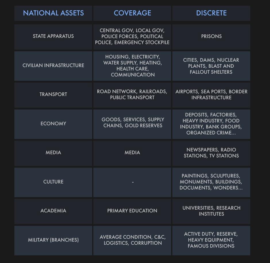 Среди наиболее значимых активов залежи ресурсов: ископаемые, топливо, стратегически важные минералы и урановая руда, в добычу которых могут вкладываться государства и частные организации. Электричество, измеряемое в доступности для населения (от 0 до 100%). Предметы искусства – их можно украсть и продать на чёрном рынке.