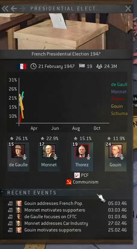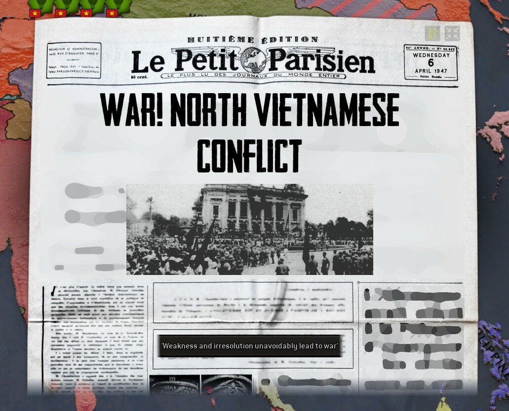 Отсутствие недавних событий в Индокитае – это не случайность. Французская колониальная администрация и вооружённые силы держат руку на пульсе общественной жизни, контролируют акторов и держат их влияние на низком уровне. Немногие малозначимые акторы черпают своё влияние или из религии (Каодай или Хоахао), или из организованной преступности (Бинь Хуен), либо из Парижа (всё остальное). Началом для нас станут 6 миллионов вьетнамцев, ждущих освобождения. Им, однако, придётся подождать, пока мы не закрепимся на севере. Чтобы достигнуть этого, нам придётся нацелиться на Францию
