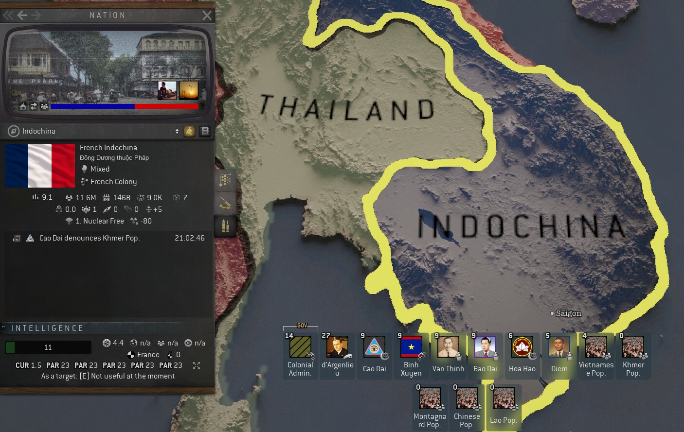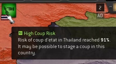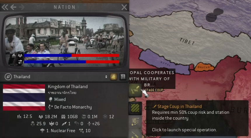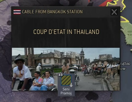Таиланд на данный момент желает придерживаться статуса-кво. Его участие в новейшей истории довольно многогранно и включает в себя участие в оккупации Индокитая, поддержанное Японией. Кроме того, население Таиланда больше, чем у Индокитая, а сравнительно большая армия могут превратить Тай в полезного союзника в грядущей борьбе за выживание государства. Следовательно, мы направим туда наших самых опытных оперативников – подразделение под руководством Хо Трон Ба, чтобы устроить разведпункт в Бангкоке и затем внедриться для извлечения выгоды из местной политической обстановки.