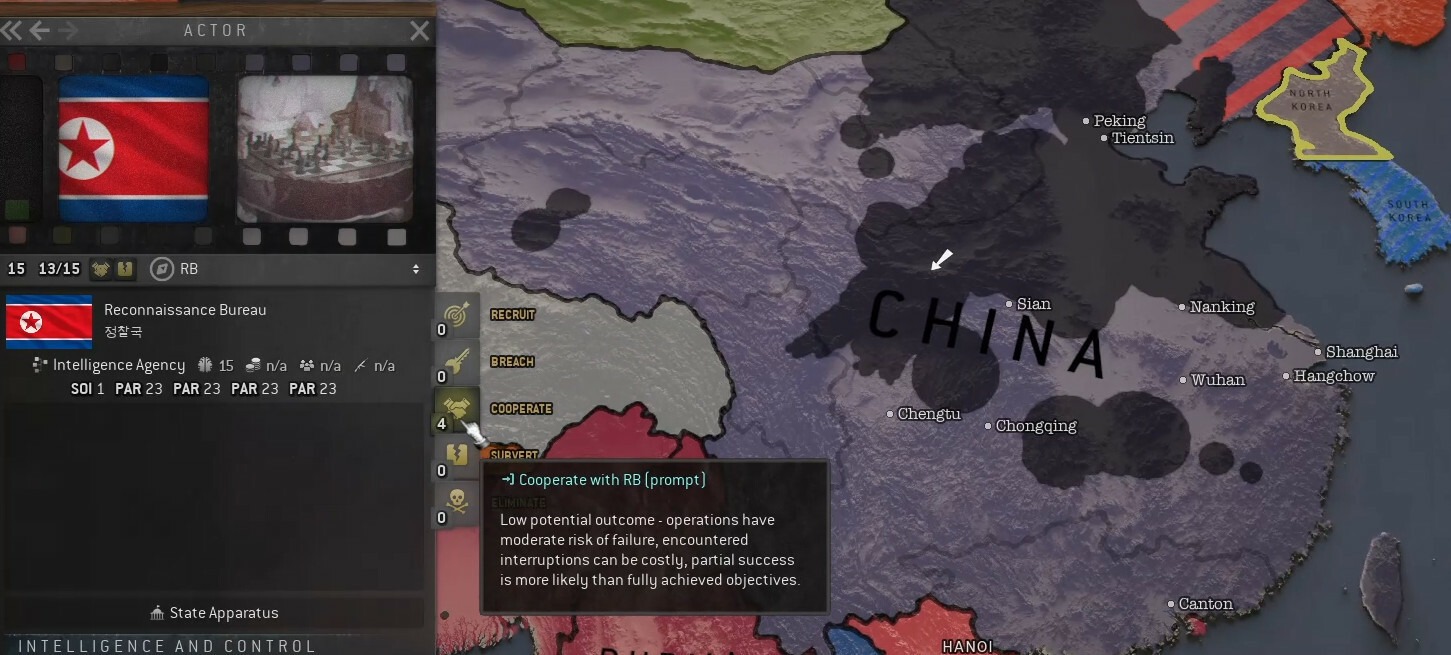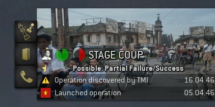 Разведоперация теперь больше похожа на гонку на время между «нападающей» и «обороняющейся» службами (зелёная и красная круговые диаграммы сверху). Нападающий игрок через действия оперативников готовит почву и приводит в действие просчитанные шаги плана, получает со временем лучшие варианты потенциального исхода (звезды и ярлык «возможности» сверху). Параллельно этому, контрразведка работает над тем, чтобы сорвать операцию (любым способом, от наблюдения до убийства агентов). Как только будет возможен самый минимальный позитивный исход операции, игрок может санкционировать исполнение финального шага операции (кнопка сверху слева). Очевидно, гонка ради минимального результата не принесёт большой пользы. Польза будет возрастать со всё большим изменением положительного исхода. Многие операции превращаются в настоящие микро-войны.