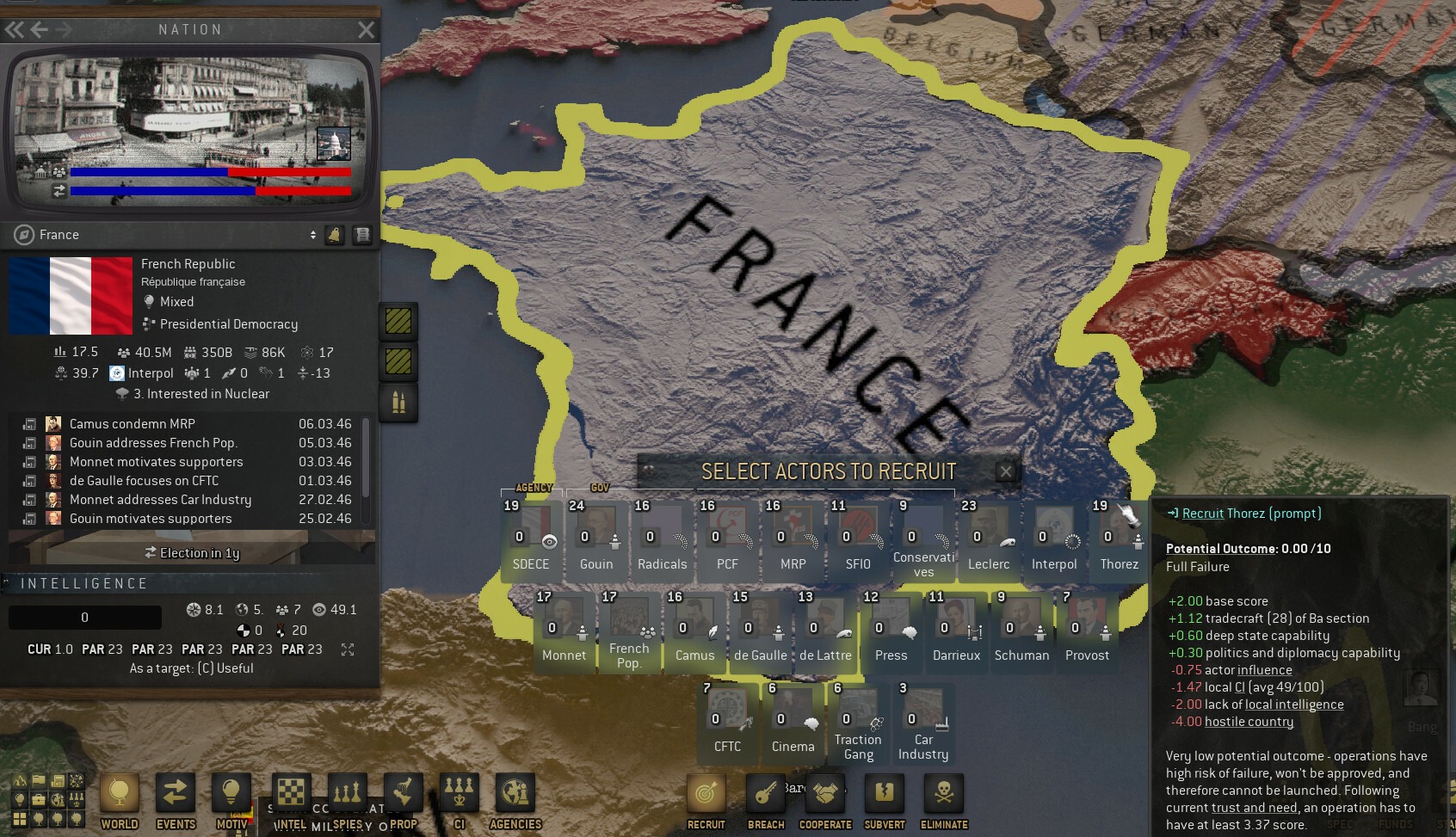 Начальное положение можно считать удовлетворительным. В маленькой опустошённой стране нам не получится вести широкую работу по рекрутированию. Каждый арест (или что-то похуже) будет болезненным. А мы сами, не обладая широким политическим признанием, даже не можем предоставить дипломатический иммунитет нашим офицерам!