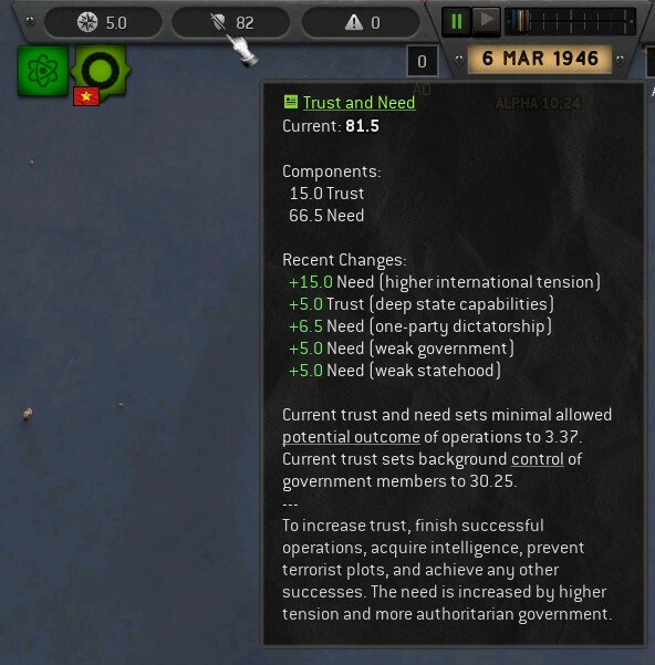 Разведывательные операции в таком враждебном окружении пока невозможны. Нам недостаёт инфраструктуры, местных сетей разведки, финансирования и ресурсов. Коснувшись этой темы, давайте быстро рассмотрим текущее (для этого AAR и для этого билда игры) состояние основных ресурсов, которое можно увидеть на верхней строке. Она претерпела изменения с тех пор, как была описана в предыдущих дневниках.