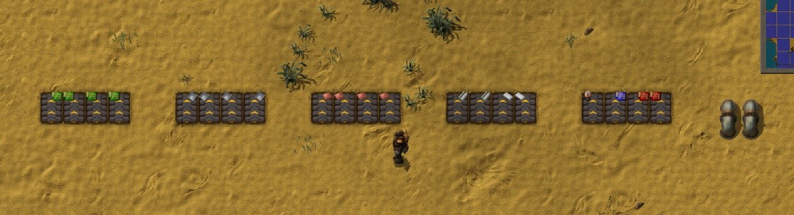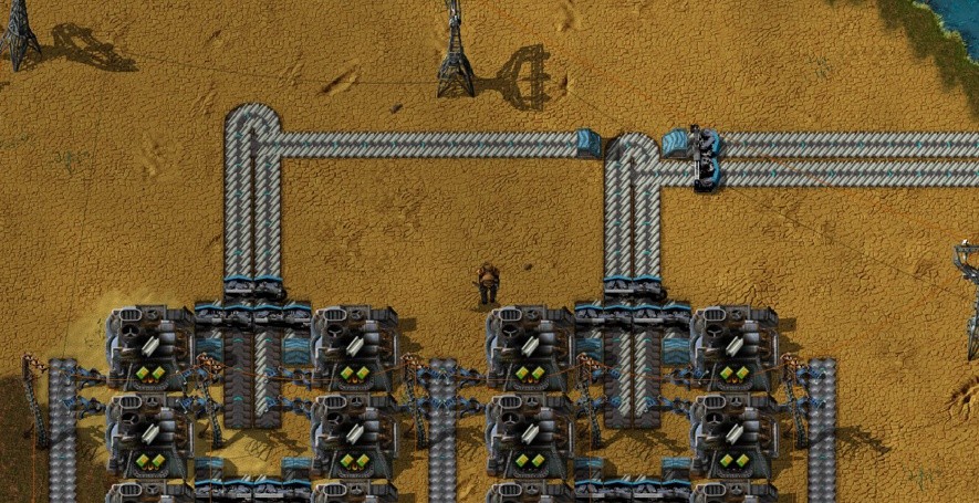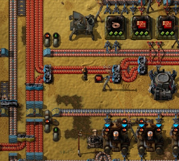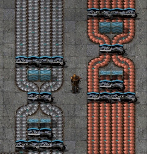 Большинство ваших отводов с шины ресурсов будут в виде одного конвейера, который транспортирует сразу 2 различных ресурса. Это сохраняет место, эффективно и позволяет обеспечить производство до 8-ми различными ресурсами при использовании стандартного дизайна. Т.е. 2 конвейера с каждой стороны сборочного автомата/assembling machine с 2 ресурсами на каждом, забор с которых идёт с обычных и длинных манипуляторов/inserters. Имеем 4 конвейера, на каждом 2 ресурса, 4*2=8.