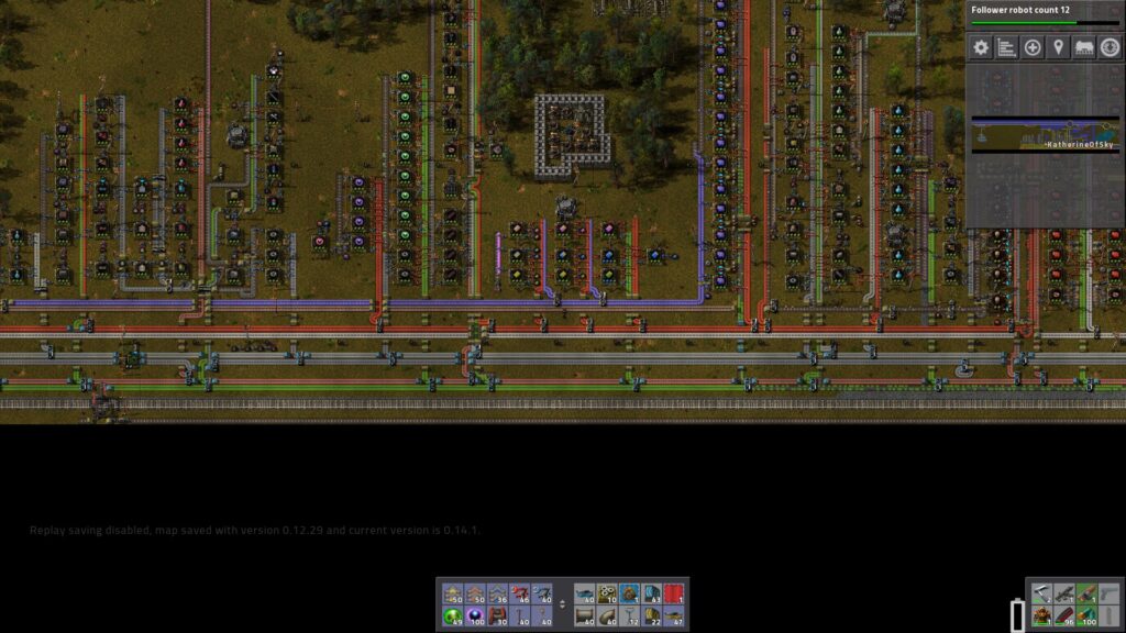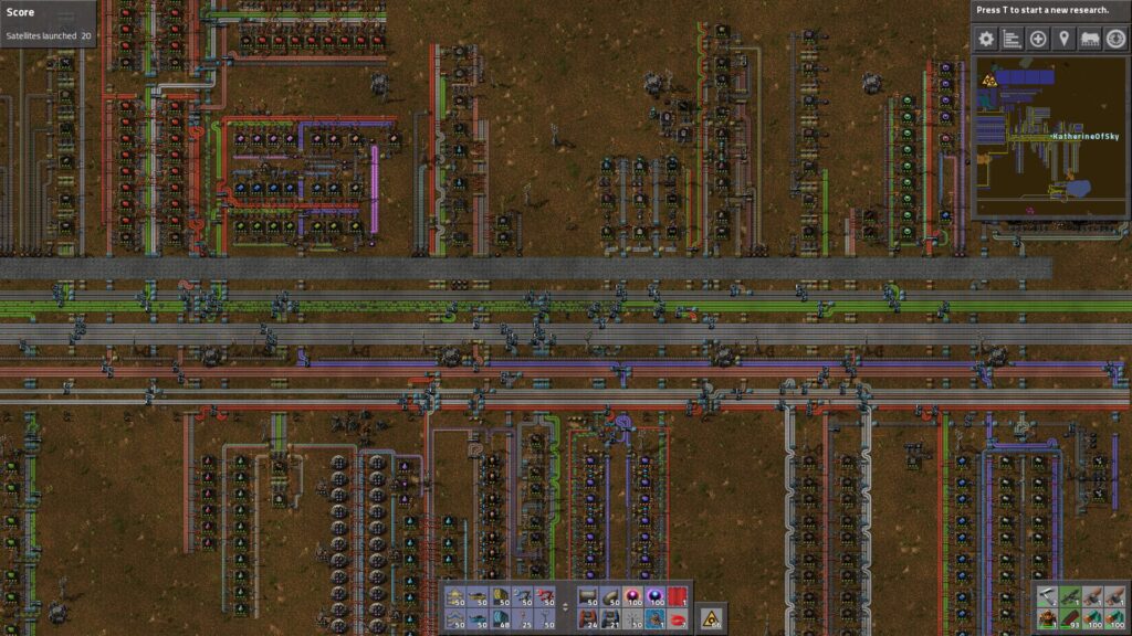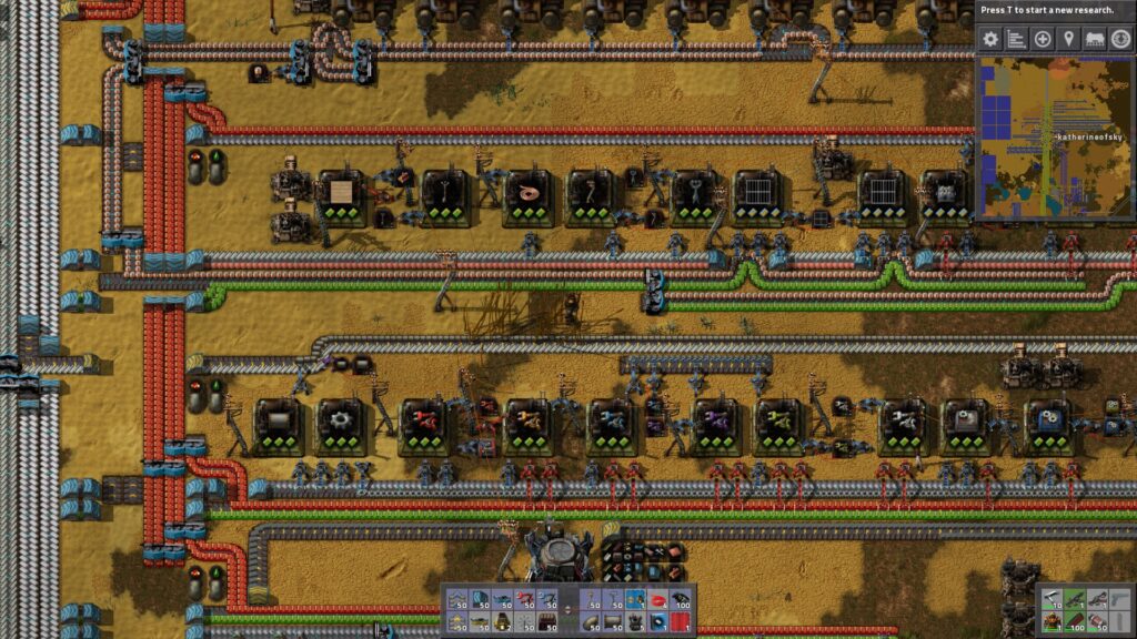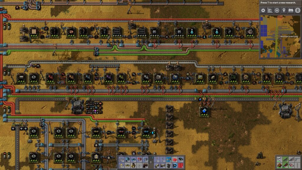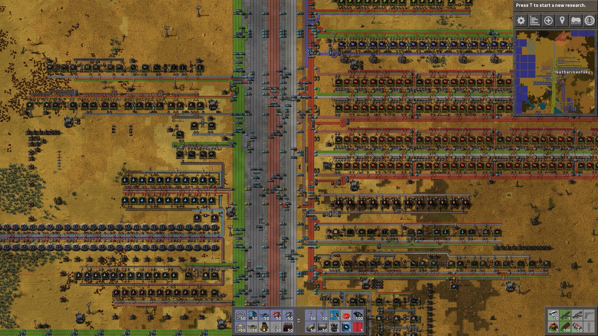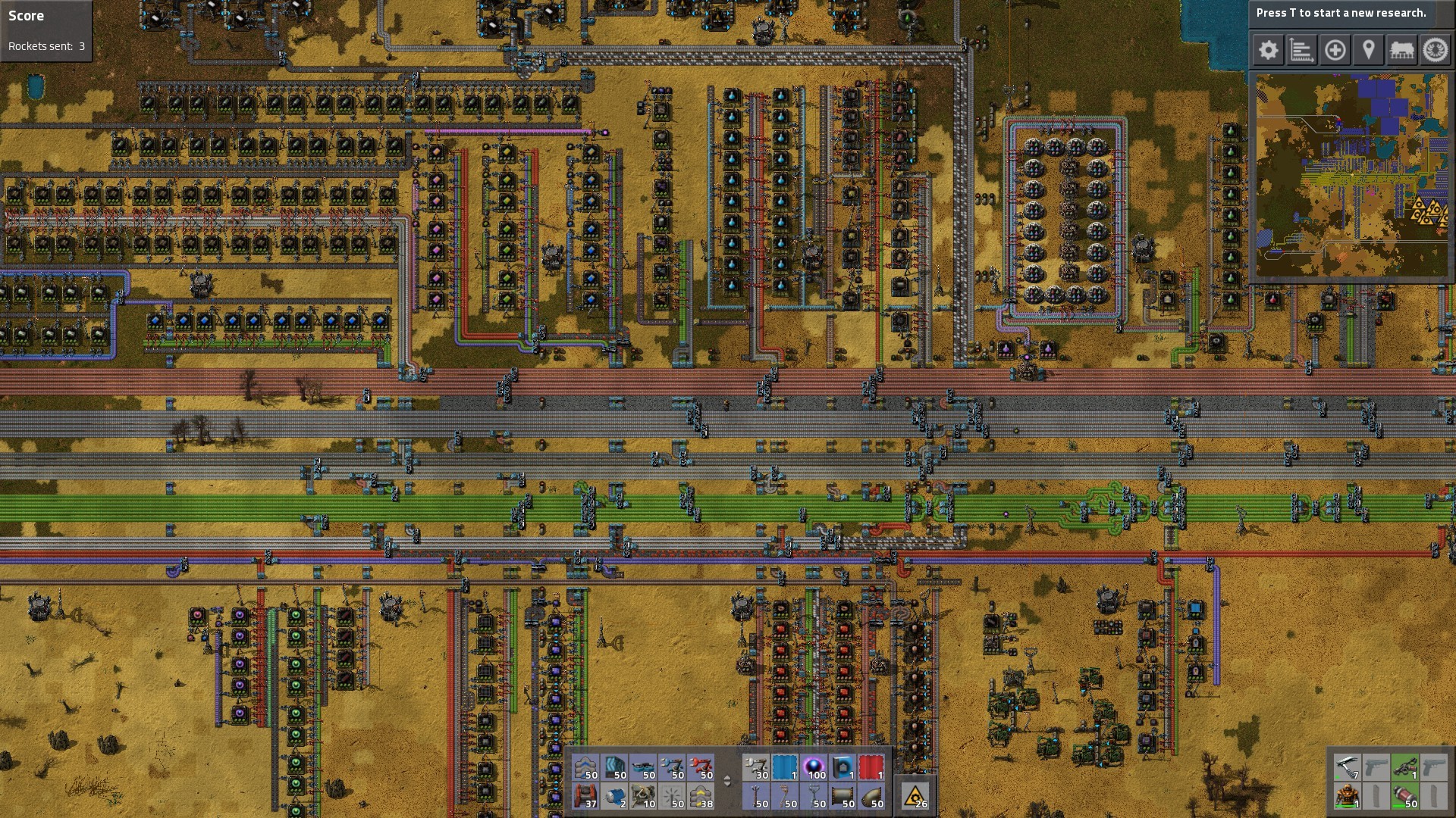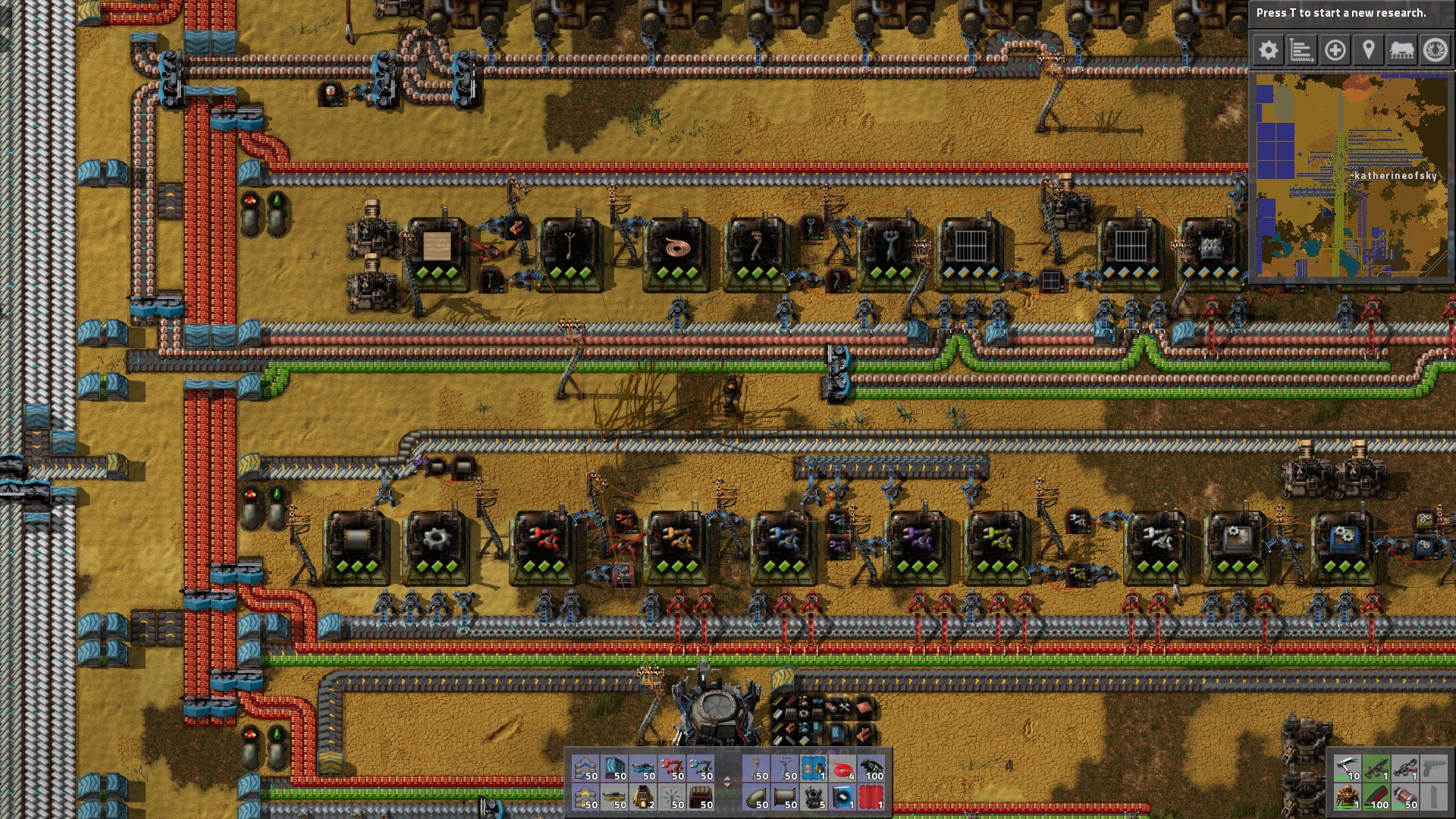 • Добавляйте больше производства для заполнения шины промежуточными ресурсами: медными/copper и железными/iron плитами, сталью/steel, зелёными электросхемами/green circuits и другими.