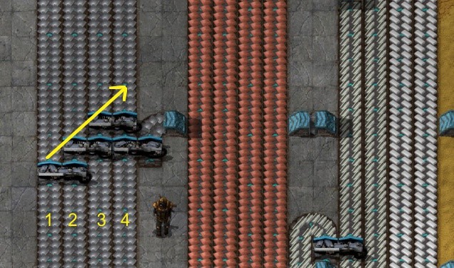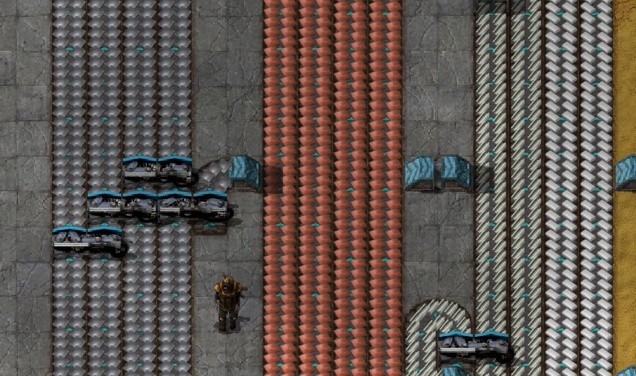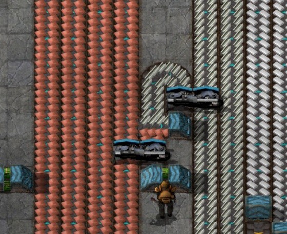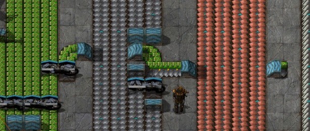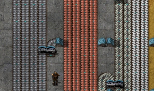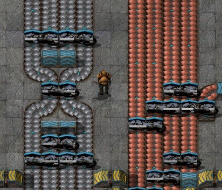 Есть пара различных структур, которые вы можете использовать в дизайне своей шины ресурсов. Некоторые игроки соединяют все конвейеры вместе, однако я настоятельно рекомендую дизайн вида 4 конвейера, 2 пустых клетки, 4 конвейера и так далее с трубами на одной из сторон. Этот дизайн позволит легко отводить ресурсы с одной из сторон, так как эти две пустых клетки оставляют место для погружения (1 клетка) и выхода (ещё 1 клетка) подземного конвейера.
