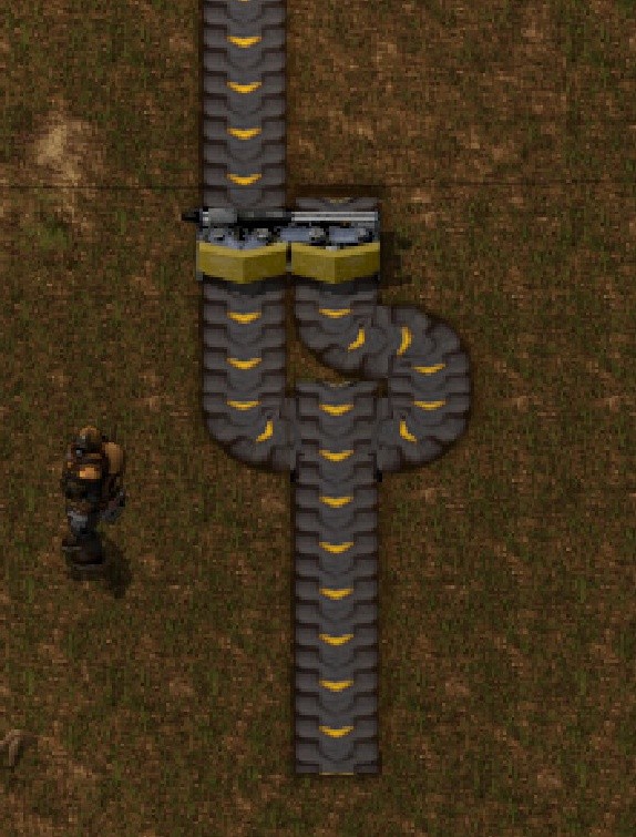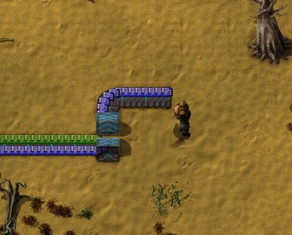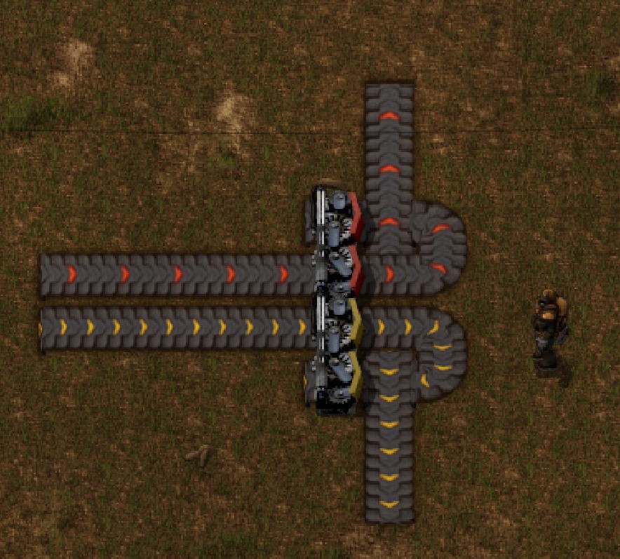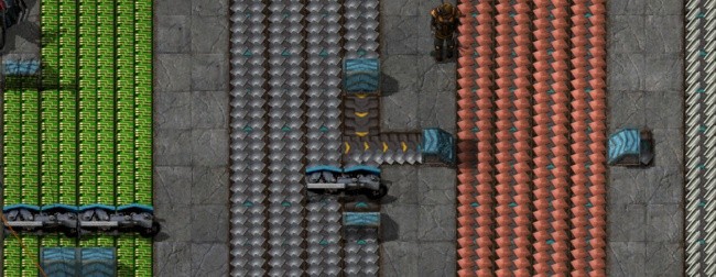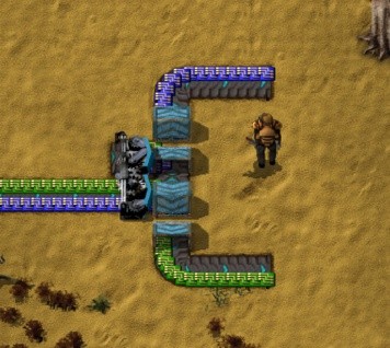В данном случае ваша цель – создать вот такую структуру: два конвейера снабжают третий с двух сторон, образуя конструкцию в виде буквы Т. Так как каждый конвейер при присоединении к другому может сбрасывать ресурсы только на одну его сторону, в итоге вы получите выходную линию, транспортирующую два разных ресурса.