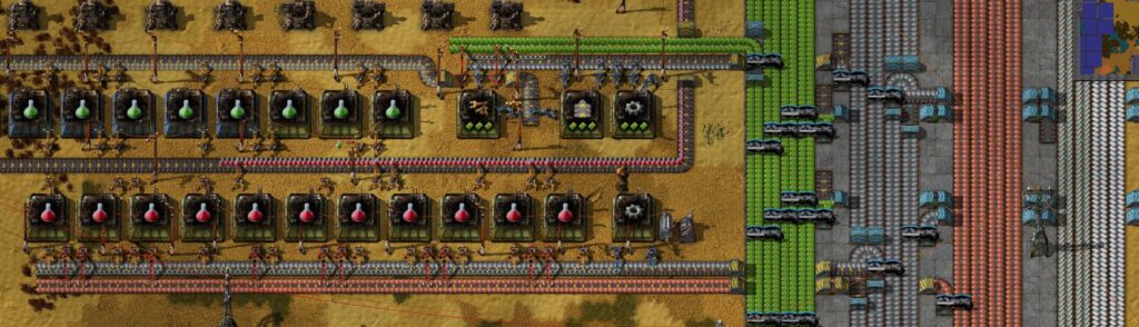 1. Расположите сборщики: 1 для создания шестерней/gears, 1 для создания конвейеров/belts и 1 для манипуляторов/inserters, и затем 8-10 сборщиков зелёных колб. Расположите их с отступом в одну клетку от красных колб на конвейере – зелёные колбы займут его другую сторону.