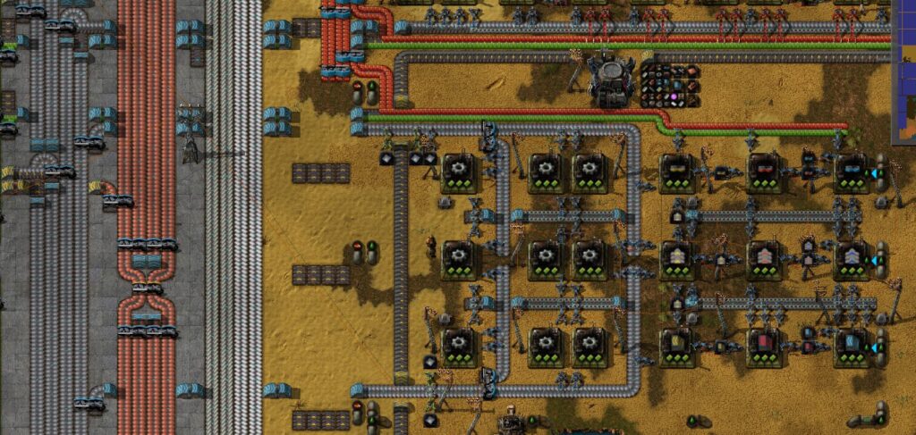 Отводы от шины ресурсов могут обслуживать несколько производств различных продуктов. На скриншоте – один тройной отвод обслуживает сразу несколько сборщиков манипуляторов/inserters разного цвета
