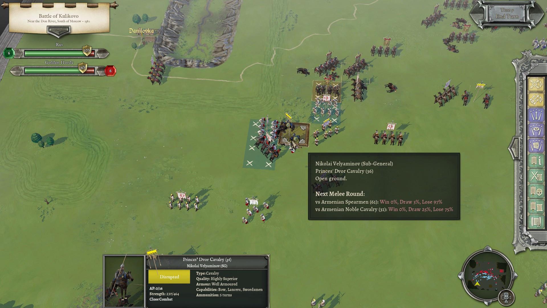 Здесь ситуация выглядит похоже на предыдущий скриншот, но это только кажется. Один из младших полководцев обречен на поражение, однако он оттянул на себя своим прорывом значительные силы врага, позволил догоняющим соратникам ударить в тыл связанному боем противнику, да и перед тем, как погибнуть, успел нанести серьезный урон морали противника своей устойчивостью в смертельной схватке. Что интересно, в реальной истории Микула Васильевич (выбранный разработчиками перевод имени вполне приемлем, хотя не идеален) также погиб на Куликовом поле.