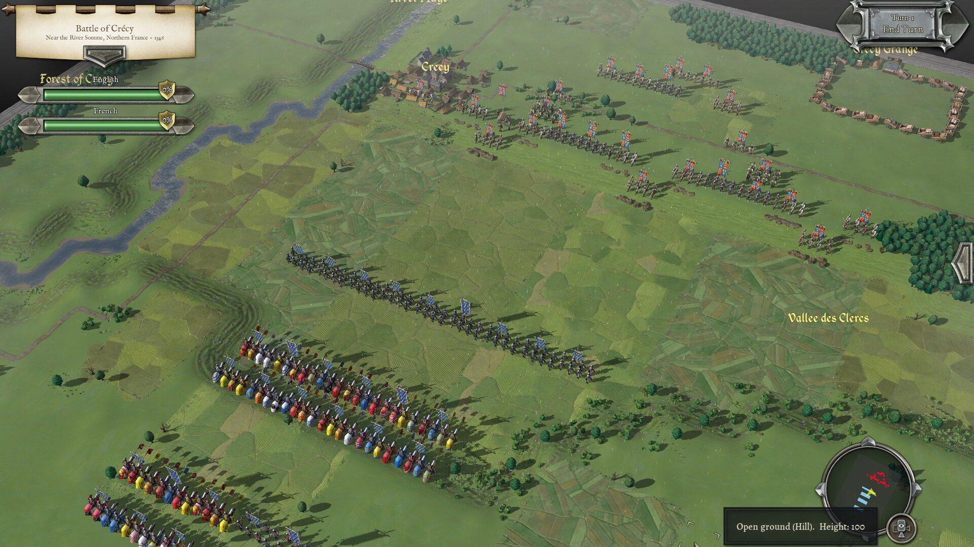 И всё вышеперечисленное в игре восстановлено далеко не так хорошо, как хотелось бы: лучники действуют с рассчитанной исходя из одного-двух колчанов эффективностью и не имеют никаких специфических бонусов в рамках этой баталии. Поэтому (а также потому, что внутриигровой ИИ понимает сложившуюся ситуацию явно лучше французских рыцарей в реальности, чья гордыня и безалаберность послужили причиной катастрофы, унёсшей жизнь порядка трети французского дворянства) — битва значительно сложнее для англичан, чем можно было бы ожидать. Умело маневрируя кавалерией, ИИ обрушивает фланги, и только потом наламывается на центр, создавая эффект домино. И никаких вам наскоков небольшими группами — ИИ норовит против всякой исторической достоверности (зато во славу здравого смысла) перестроится перед атакой, максимизируя вес первого таранного удара, главную силу тяжелой рыцарской кавалерии.