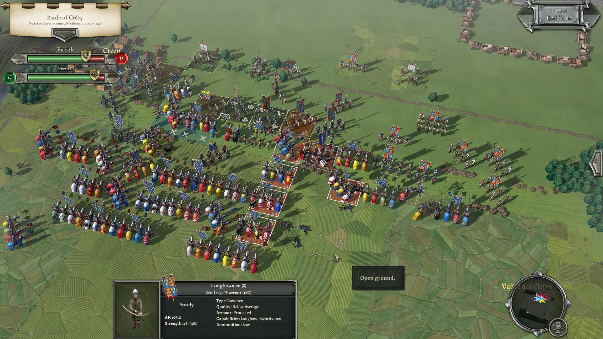 А вот английские лучники с их длинными луками доминируют над полем боя — увы, боезапас истощается значительно раньше чем хотелось бы.