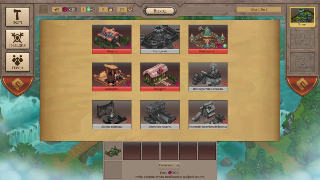 Боевые единицы нужно готовить к бою. К нашим героям это относится точно так же. Их можно снаряжать артефактами, повышать им уровень за счёт накопленного опыта и увеличивать характеристики за счёт построек на базе. База в этой игре зовётся Фортом.