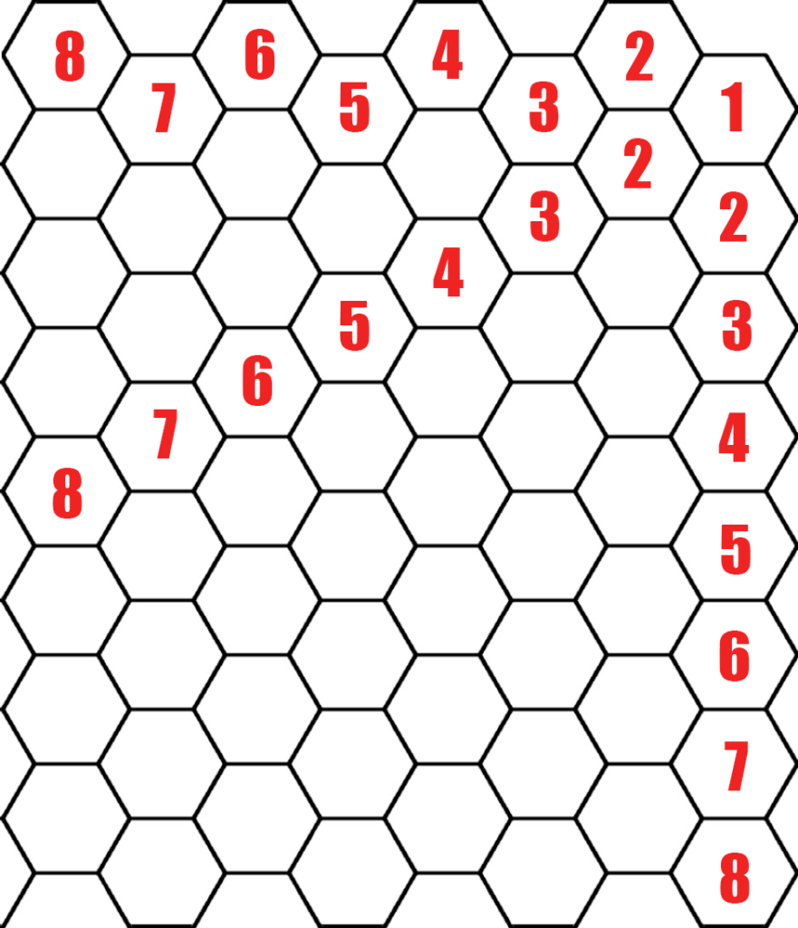 А при таком расположении всё наоборот. Яркий пример «пьяной походки», которой подвергаются юниты на гексагональных сетках.