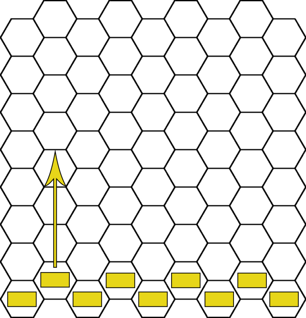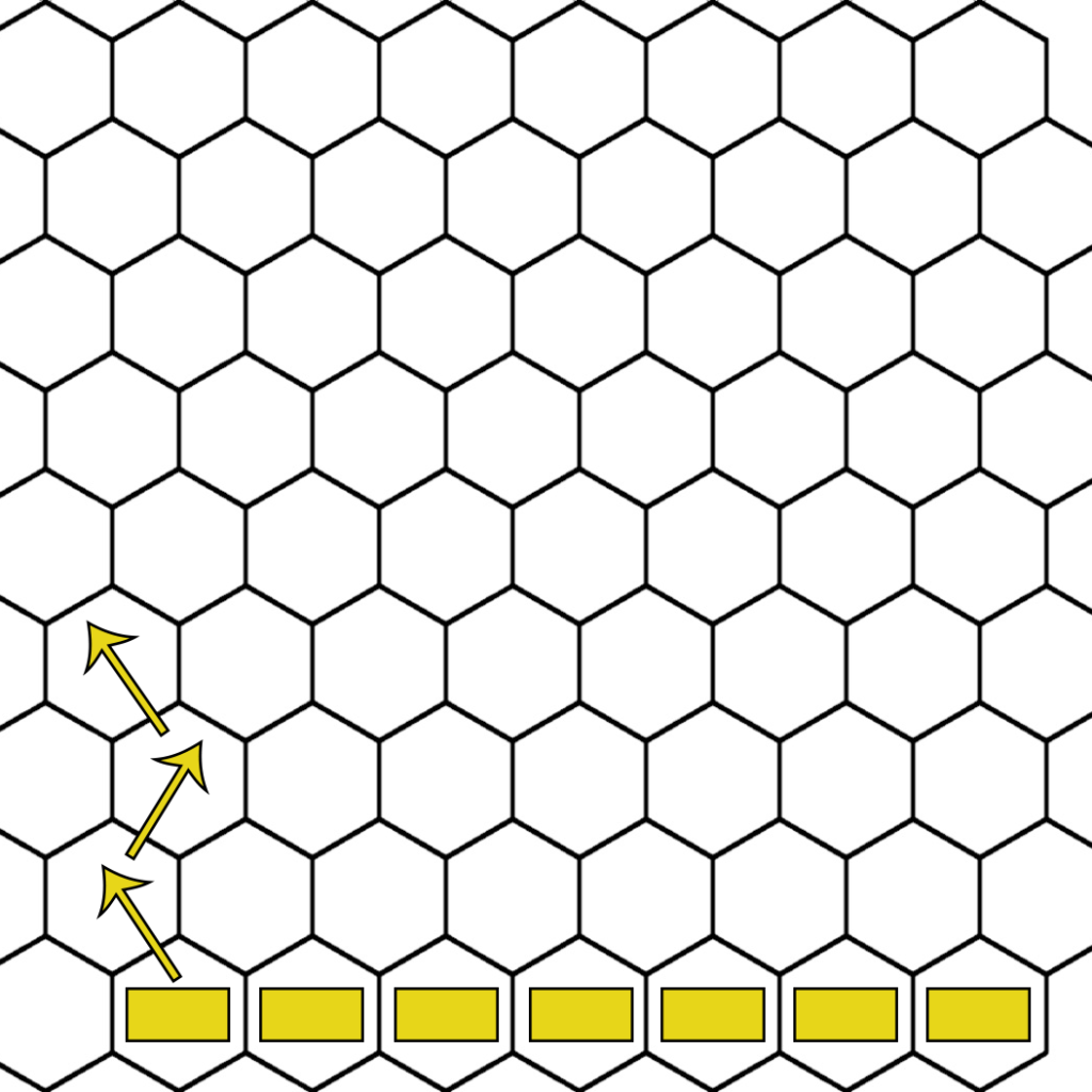 В то время как квадратная сетка с возможностью действий по диагонали представляет возможность двигаться ровно во всех направлениях и выстраивать ровные построения юнитов, с гексовой сеткой возникают затруднения. В зависимости от стороны, в которую расположена гексовая сетка, мы либо сможем ходить по прямой, но не будем иметь возможность создать ровный строй юнитов, либо наоборот.