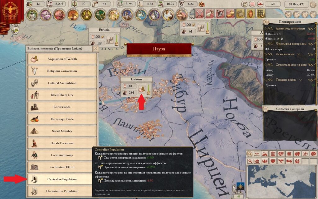 Ещё один способ повысить число граждан – мотивировать население переезжать в города, так как города имеют большой бонус к «оптимальному числу» граждан. Сделать это можно при помощи специальной политики «Централизация», которая повысит миграцию в столицу провинции (а столица – это обычно город). Для этого на карте провинций выберите нужную политику.
