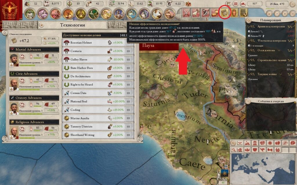 Играя в Imperator: Rome, вы могли столкнуться с всплывающей подсказкой, говорящей о низкой эффективности исследований.