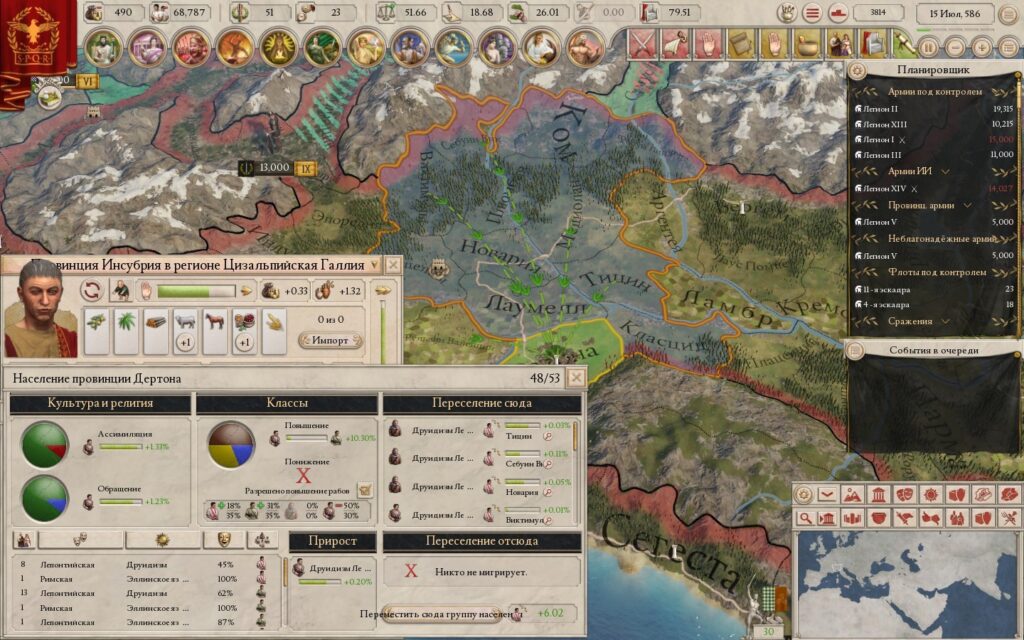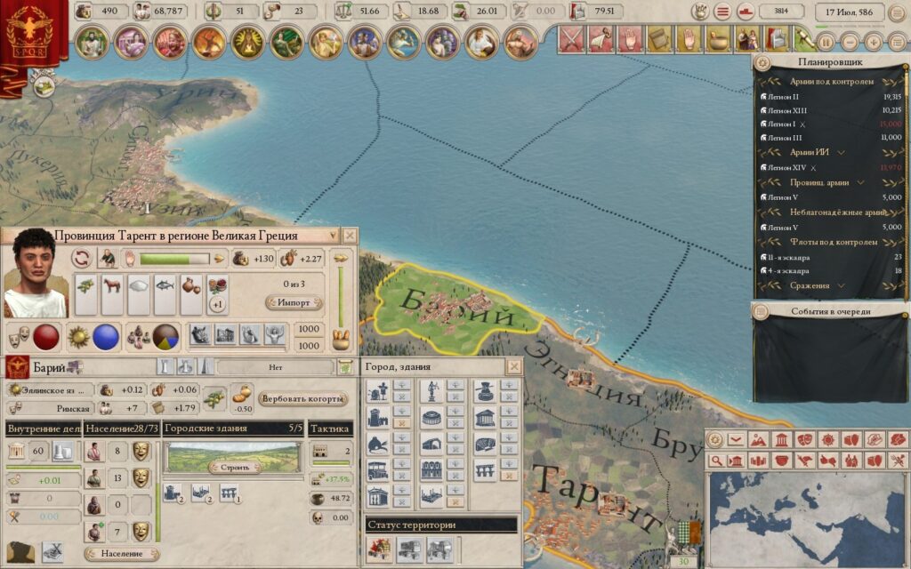 Играя в Imperator: Rome, у меня действительно создаётся ощущение, что я непосредственно влияю на формирование мира. Ассимиляция населения, повышение уровня цивилизованности, возведение городов в диких варварских землях – всё это придаёт ощущение развития своего государства и своих земель. А ещё построенные города графически отображаются на карте мира и увеличиваются в размерах при росте.
