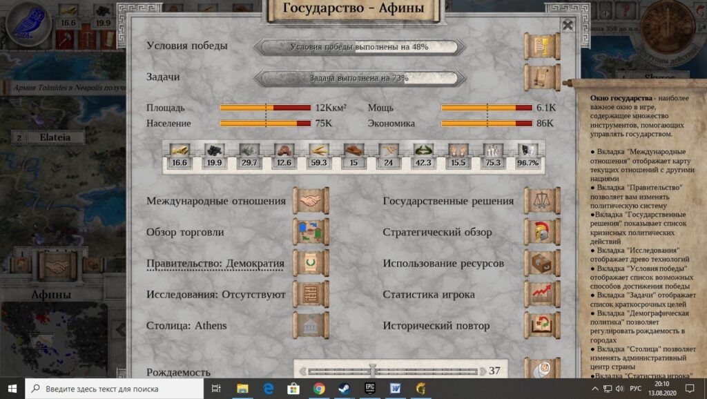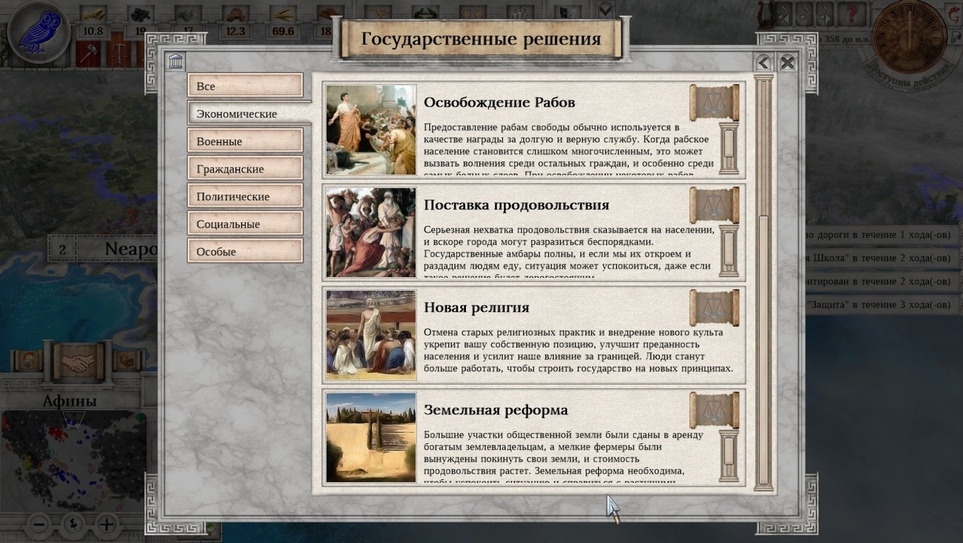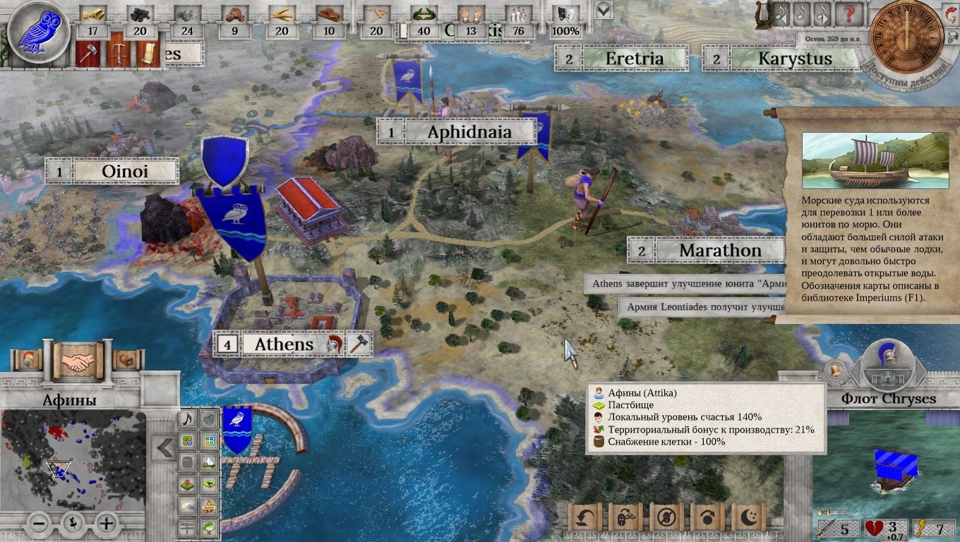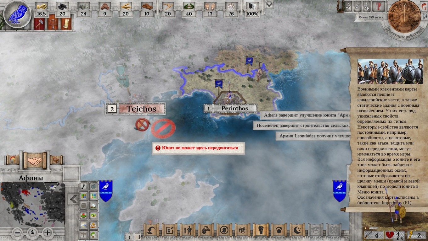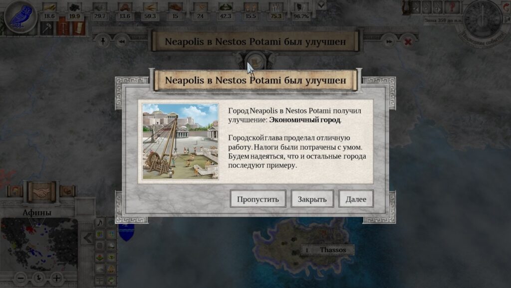 Что там доступно в «cвободном плавании»? В принципе, Афины занимают весьма прочное место в античном мире. Есть союзные договора, а все враги далеко за горами, да за морями. И что там за враги? Варварское Одрисское царство, и не менее варварская Македония. Опасение вызывают, разве что, северные колонии древнего полиса… но с этим как-нибудь разберусь. Например, предложив договор дружелюбно настроенному государству. Вот только оказывается, что Афины никто особо и не любит. Максимум – терпят. Все равно попытаюсь. Вот, к примеру, держава Халкидики. Чего вам дружить с грязными македонцами? Давайте к нам! Отправляю требования: отказаться от мира с Македонией, а взамен – получить доступ к нашим торговым путям. Раз и отправлено! Или нет? Непонятно, ибо экран дипломатии можно закрыть только через крестик. Что там дальше? Армия. Классические гоплиты и пельтасты, которых можно «прокачать», чем и займусь. А теперь к делам государственным. Поселенец? Отлично. Местные поселенцы могут строить всякие улучшения. Поля, дороги, ну и города конечно. Что там ещё может быть важно? Ну конечно. Окно управления государством. Там можно посмотреть список текущих задач и процент их выполнения (привет, Imperator: Rome), условия различных вариантов победы, тип правительства, текущие исследования и много чего ещё. Вплоть до счета игрока в конкретный момент времени и расположения стратегически важных точек на карте. Функционально, что тут сказать, хоть и несколько архаично. Внизу «правительственного» экрана находится весьма важный ползунок, отвечающий за субсидии на деторождение. Больше материнского капитала – меньше золота в вашей казне. Но в перспективе станет больше! Есть о чем подумать.