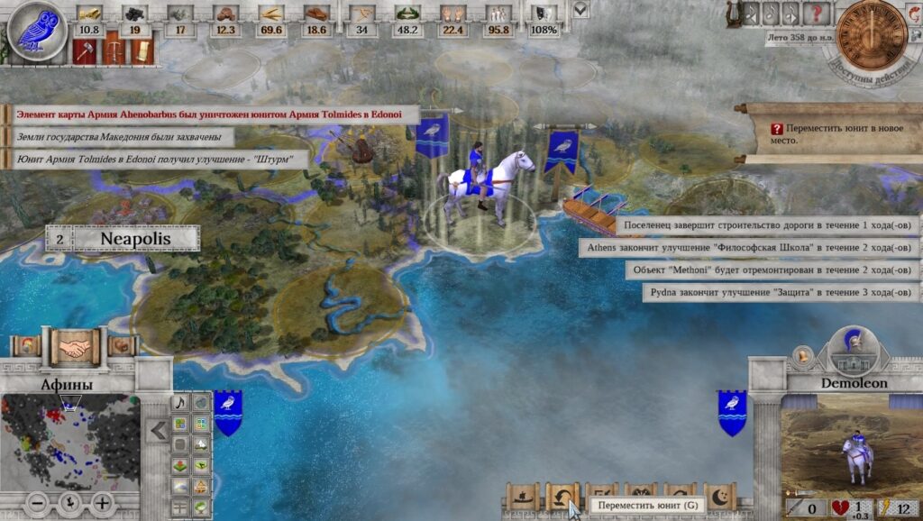 Ещё несколько ходов. Города строятся, исследования открываются. На севере Одрисское царство грабит мои владения и убивает поселенцев. Чуть западнее мне удается разбить одну из македонских армий. Между тем флоты медленно, но верно везут тяжёлых гоплитов туда, куда и Макар телят не гонял. Все идёт по плану.