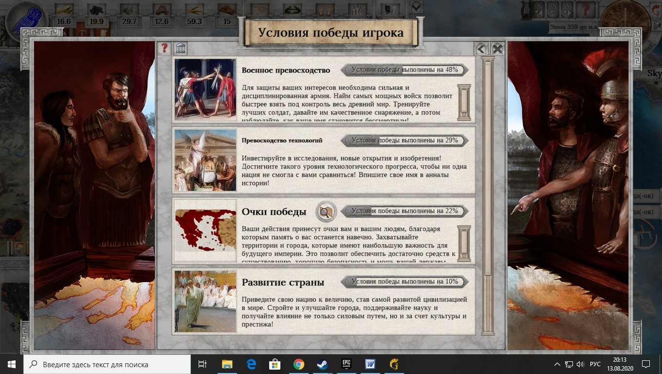 Следующую группу ресурсов условно можно назвать «интеллектуальной». Это знание, влияние и… счастье. Со знанием и влиянием, в целом, всё понятно: знание тратится на открытие новых технологий, а влияние используется для разных государственных решений и «мирной» экспансии. Также, с помощью мощного влияния можно деморализовать вражеские армии и подчинить своей воле города неприятелей. А что же счастье? Этот ресурс так или иначе влияет на состояние дел в государстве игрока. Низкое счастье? Здравствуй, восстание. Счастье на высоте? Значит, народ закрывает глаза на произвол владык и позволяет успешно строить сильное и стабильное государство. Последнюю категорию ресурсов условно можно назвать, как «человеческий потенциал». Тут количество населения и… количество рабов. Да, рабы за население не считаются, что вполне себе коррелирует с эпохой, в которой происходит действие игры. Итак, население позволяет создавать новые армии, производить знания и влияние, но при этом оно же расходует материальные ресурсы. Рабы же добывают тот самый камень, уголь, или что-то еще. Просто и понятно.