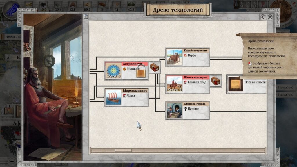 Реализация исследований тоже не сильно радует – древо исследований достаточно жидкое. Причём, если кто-то подумал, что может как в Цивилизации медленно и верно исследовать вообще всё, то подумал он это зря. Прежде чем запустить исследование, надо накопить соответствующее количество ресурсов. Чаще всего просто знаний, реже других ресурсов. Политические решения? В какой-то момент тоже приходит понимание, что это достаточно скучно. Дать рабам свободу или усилить для них репрессии? А какая разница, если я просто получаю небольшой бонус или штраф? В глобальном масштабе влияние на игру будет не особо и ощутимо. Строительство в городах? Тоже скучно. Увеличить экономическую мощь/укрепить город/создать в городе философскую школу – вот и всё.