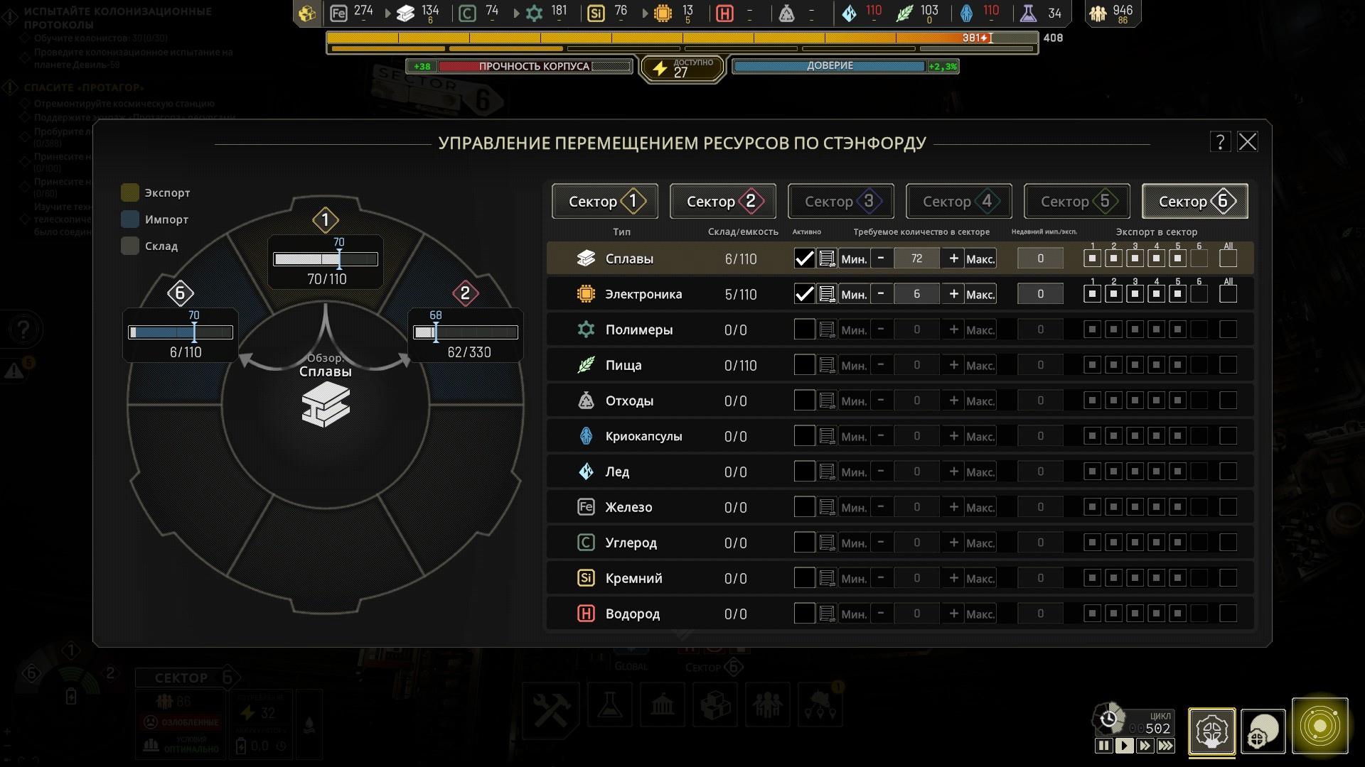 Разделение станции на разные секторы не является чисто эстетическим, ведь каждый сектор обладает определённой автономностью, хотя и связан с другими. В частности, можно и даже необходимо осуществлять перераспределение ресурсов из сектора в сектор, например, перевозить пищу из сельскохозяйственного сектора на склады жилых секторов. Разумеется, специализация сектора на производстве конкретного типа ресурсов приносит свои бонусы.