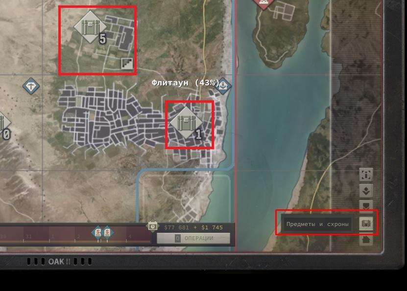 • Схрон сектора. Это четвертая и наиболее интересная часть инвентаря. В каждом секторе есть свой статичный тайник (схрон) с шестнадцатью ячейками. Это не какое-то конкретное место в секторе, как сундук или ящик, а некоторая фиктивная секция инвентаря, в которой можно хранить любые предметы. Чтобы выбрать схрон сектора, нажмите ПКМ на интересующем секторе на спутниковой карте и выберите схрон (или нажмите клавишу «Н»). Если там есть отряд, то тайник автоматически отобразится по центру окна инвентаря.