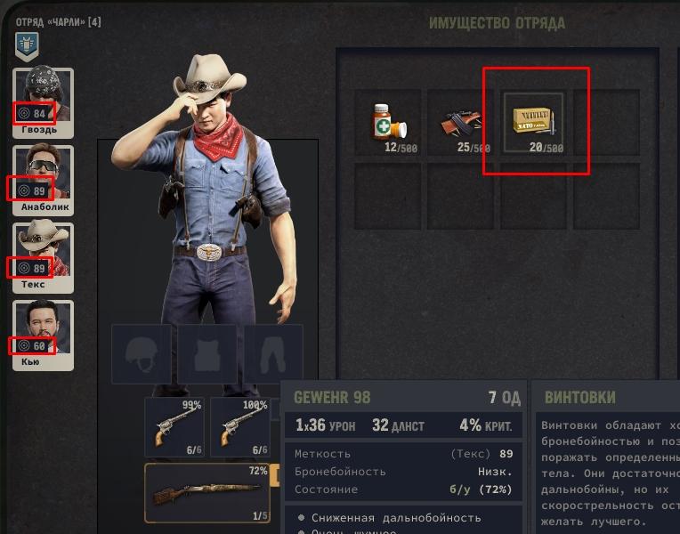 При наведении курсора на оружие в инвентаре, значение меткости автоматически отобразятся слева под портретами наёмников. Аналогично это работает и с гранатами и медикаментами. В добавок к этому, при наведении на оружие подсвечиваются подходящие к нему патроны и наоборот (скриншот ниже).