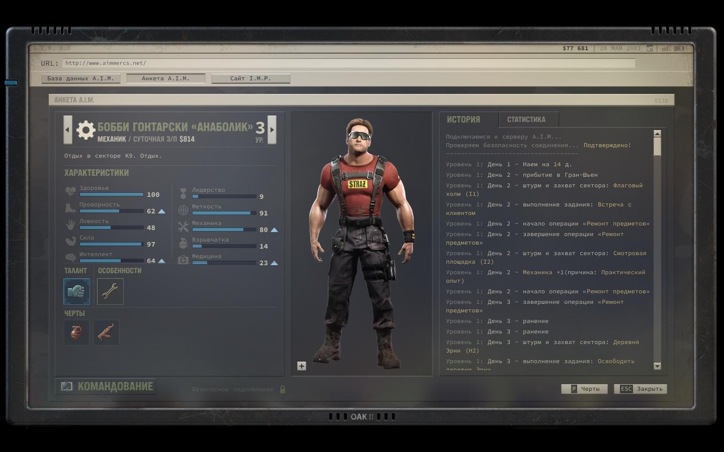 • Сила. Наверное, самый менее значимый навык. Пригодится в основном для взлома ящиков с лутом на карте. Достаточно иметь одного наёмника с высоким показателем силы для этого. Поэтому отличным выбором для начала игры станет Анаболик, который одновременно сильный и имеет бонус к взлому устройств, а также высокий показатель механики.